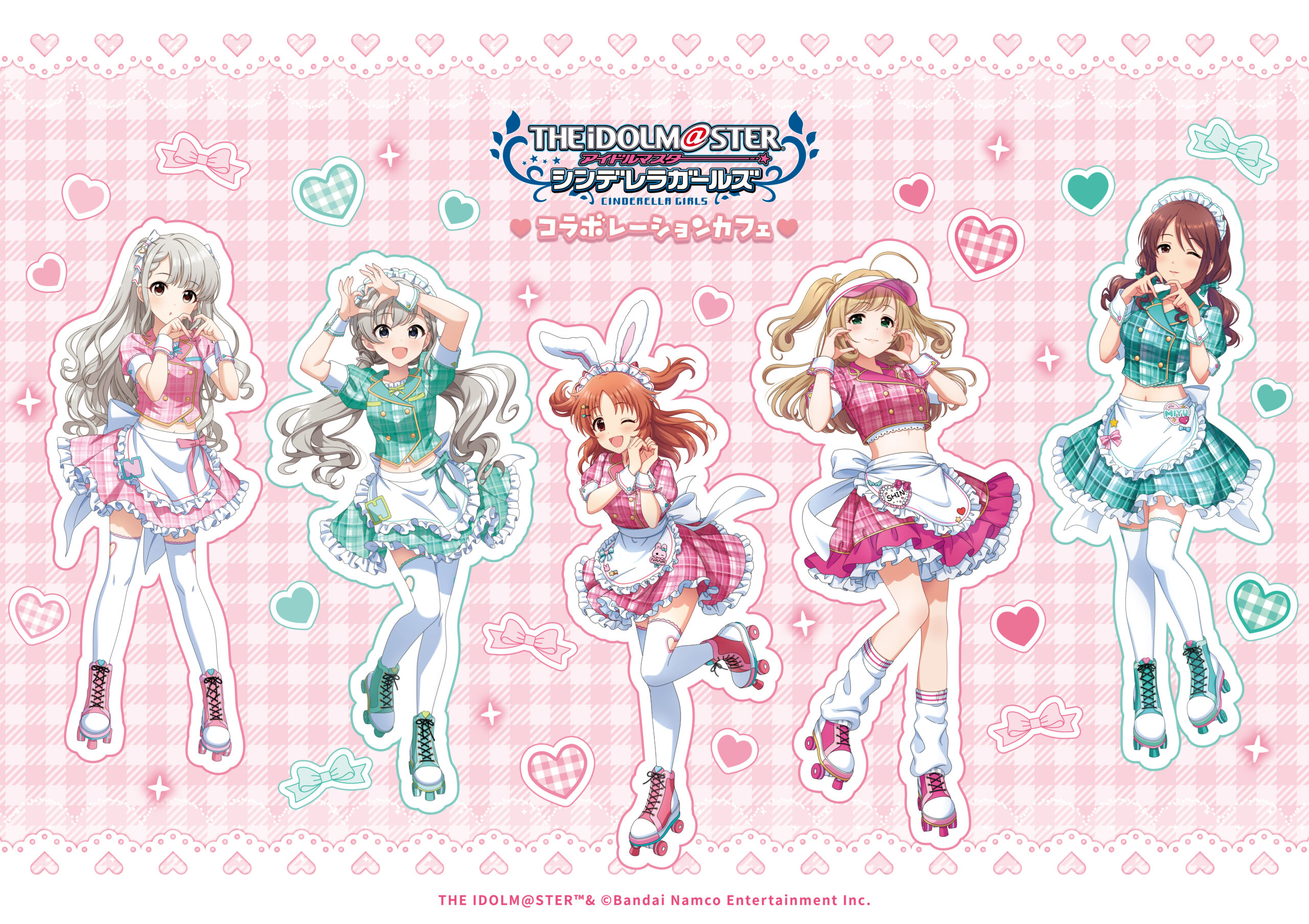 5girls abe_nana apron brown_hair english_text frills grey_hair heart heart_hands hisakawa_hayate hisakawa_nagi idolmaster idolmaster_cinderella_girls idolmaster_cinderella_girls_starlight_stage japanese_text low_twintails maid_headdress mifune_miyu multiple_girls navel official_art one_eye_closed open_mouth orange_hair promotional_art rabbit_ears red_hair roller_skates sato_shin skates sweets_paradise thighhighs twintails visor_cap white_thighhighs wrist_cuffs