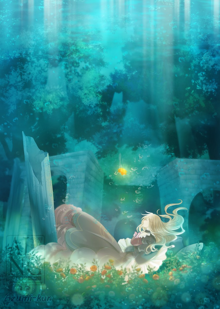 1girl album_cover_redraw azumi-kun beatrice_(umineko) black_dress blonde_hair bubble byakumu_no_mayu_-ricordando_il_passato- closed_eyes closed_mouth commentary derivative_work dress english_commentary floating_hair flower forest full_body highres nature pillar red_flower ruins solo sunlight tree umineko_no_naku_koro_ni underwater watermark