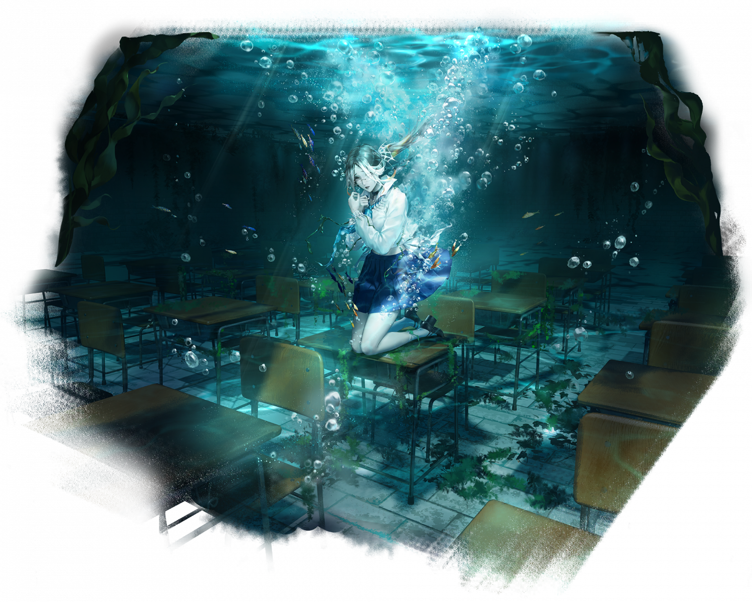 1girl air_bubble alternate_costume artist_request bespectacled black_choker black_hair black_shoes blue_necktie blue_skirt bubble chair choker desk glasses highres kneeling lamia_(path_to_nowhere) long_sleeves multicolored_hair necktie official_alternate_costume official_art path_to_nowhere school_desk school_of_fish seaweed shirt shoes skirt streaked_hair underwater white_eyes white_streaks wooden_chair wooden_desk