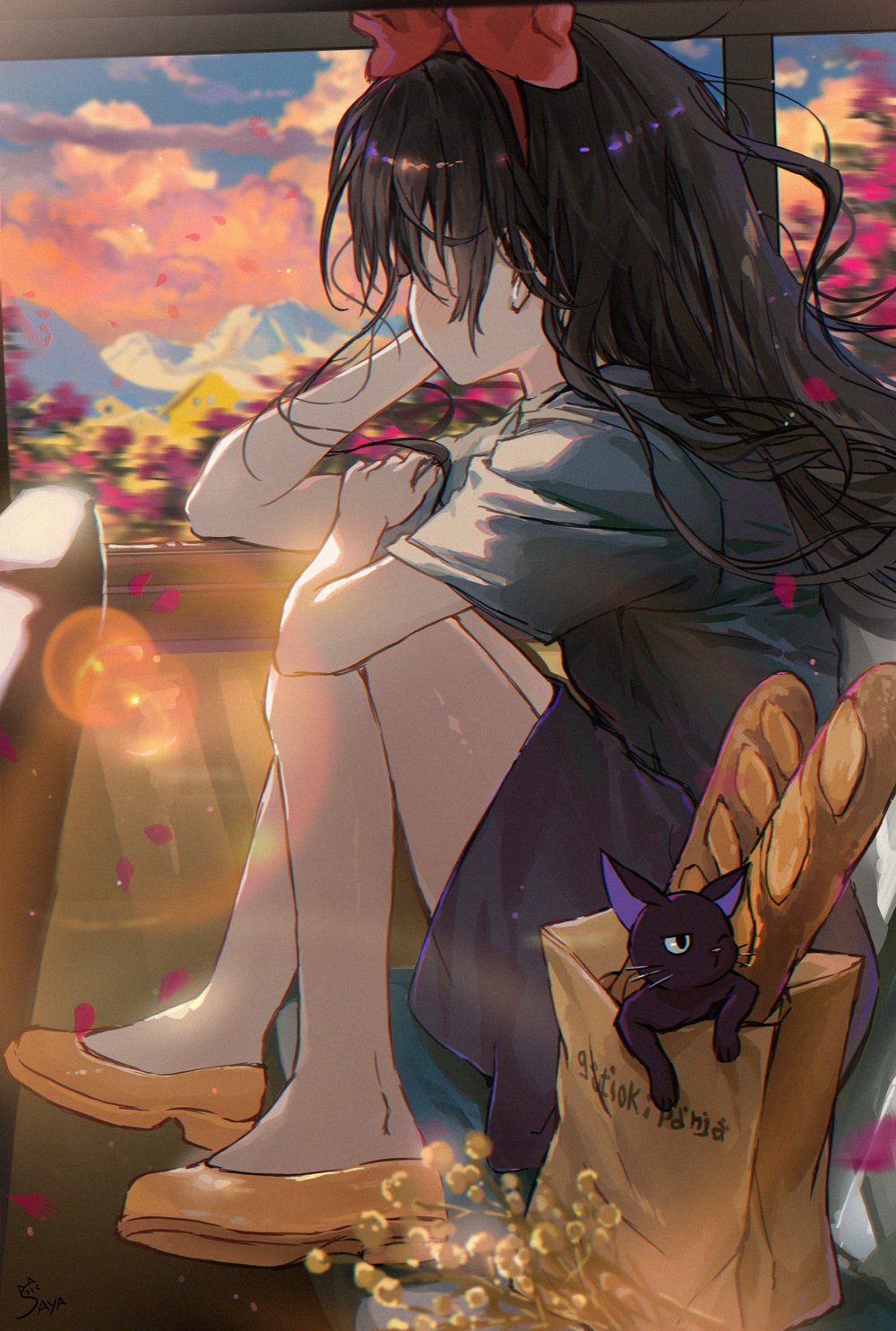1girl adjusting_hair bag baguette black_cat black_hair bow bow_hairband bread cat cloud cloudy_sky dress evening falling_petals food hairband highres jiji_(majo_no_takkyuubin) kiki_(majo_no_takkyuubin) lens_flare long_hair majo_no_takkyuubin mountainous_horizon orange_shoes paper_bag petals red_bow saya_(mychristian2) shoes short_sleeves sitting sky solo sunset