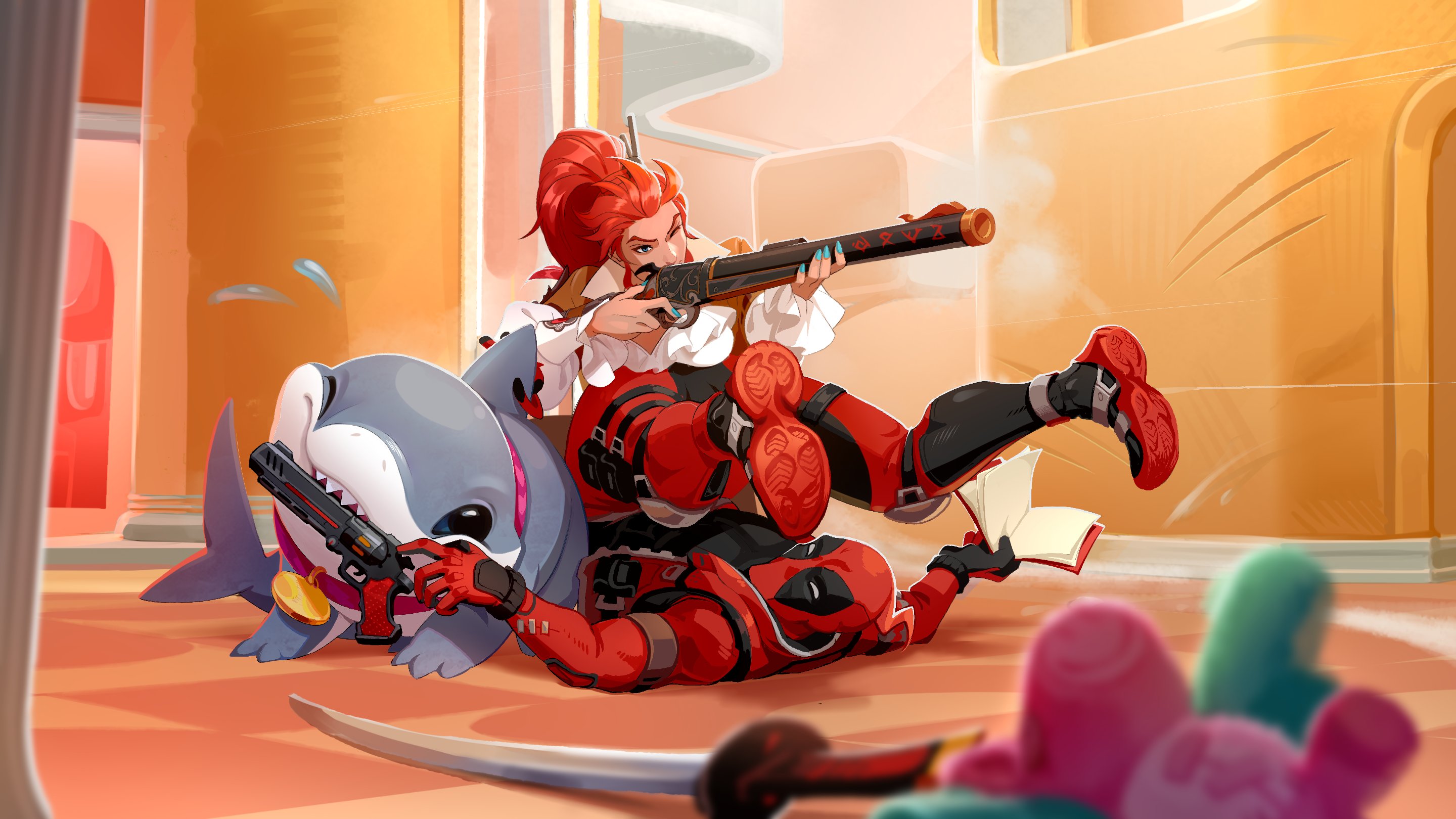 1boy 1girl aiming biting book collar commentary deadpool elsa_bloodstone english_commentary fins fish_tail flying_sweatdrops gun highres holding holding_book holding_gun holding_weapon human_shield jeff_(marvel) katana lazyboq looking_at_another looking_to_the_side marvel marvel_rivals name_tag one_eye_closed open_book orange_hair rifle shark shark_fin shark_tail stuffed_animal stuffed_toy superhero_costume sword tail upside-down weapon