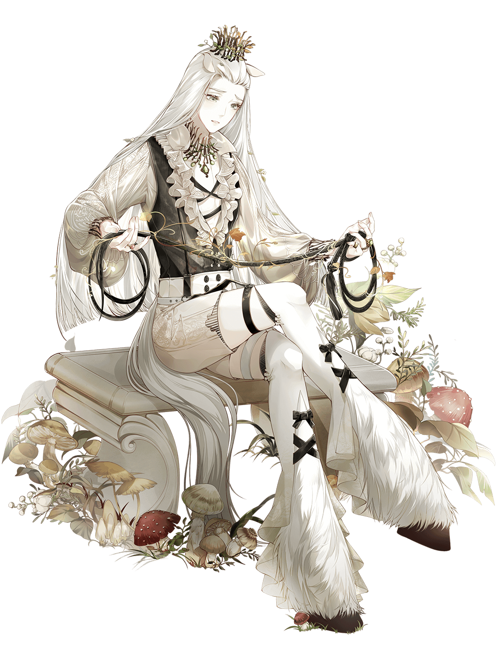 1boy animal_ears artist_request bench black_bow black_vest blunt_ends bow branch collar cotton_(plant) cotton_boll cross-laced_clothes cross-laced_top crossed_legs crown ears_down food_fantasy frilled_shirt frills frown full_body gaiters gem green_gem grey_eyes hair_ornament hair_slicked_back high-waist_shorts highres holding holding_whip hooves horse_boy horse_ears horse_tail jewelry leaf_hair_ornament legwear_garter long_hair long_sleeves looking_at_object male_focus mini_crown multiple_rings mushroom official_art pale_skin parted_lips plant plunging_neckline puffy_long_sleeves puffy_sleeves ring shirt shorts sitting solo tail third-party_source transparent_background vanilla_muffin_(food_fantasy) very_long_hair vest vines whip white_fur white_hair white_shirt white_shorts