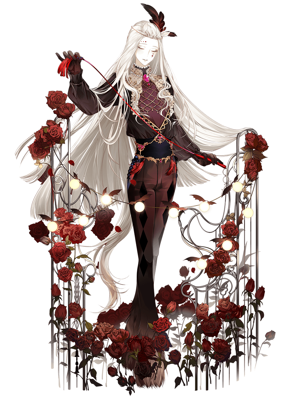 1boy alternate_costume animal_ears argyle_clothes argyle_pants artist_request black_gloves black_jacket blunt_ends brown_fur brown_pants closed_eyes cross-laced_pants face_jewel facial_mark facing_viewer feather_hair_ornament feathers fence fishnet_top fishnets flower food_fantasy frilled_jacket frills full_body gem gloves hair_ornament hair_slicked_back hand_up head_chain highres holding holding_whip hooves horse_boy horse_ears horse_tail jacket jacket_tucked_in jewelry long_hair long_sleeves male_focus mark_under_eye necklace official_art pale_skin pants parted_lips pearl_necklace pink_gem plant polka_dot red_flower red_rose red_shirt rose shirt shirt_tucked_in solo standing string_of_light_bulbs tail third-party_source transparent_background vanilla_muffin_(food_fantasy) very_long_hair vines whip white_hair