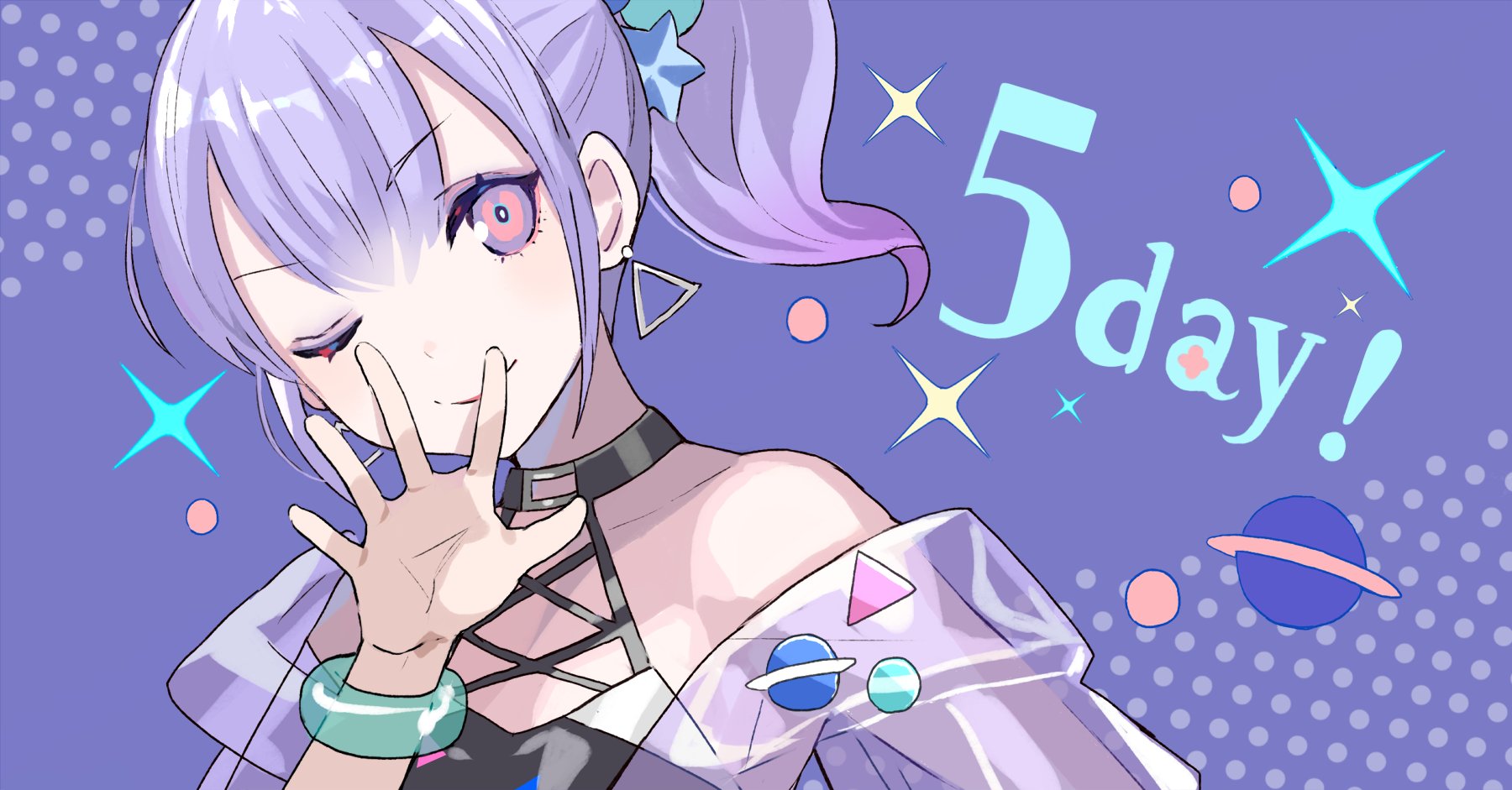 1girl ;) badge bangle bare_shoulders ben-day_dots black_shirt bracelet breasts button_badge center-flap_bangs closed_mouth cocoppa_dolls colored_tips commentary_request countdown countdown_illustration earrings estel_(cocoppa_dolls) eyeshadow hair_ornament halter_shirt halterneck hand_up highres jacket jewelry looking_at_viewer makeup multicolored_eyes multicolored_hair off_shoulder official_art one_eye_closed open_hand pink_eyes planet ponytail portrait purple_background purple_eyes purple_eyeshadow purple_jacket screentones second-party_source see-through_clothes see-through_jacket shirt short_ponytail small_breasts smile solo sparkle star_(symbol) star_hair_ornament tobi_(kotetsu) triangle_earrings two-tone_eyes