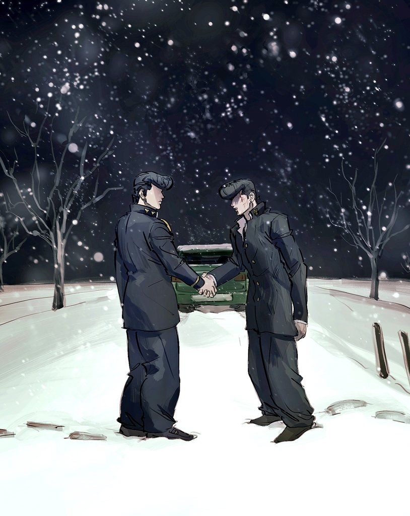 2boys album_cover_redraw bare_tree black_hair car commentary derivative_work diamond_wa_kudakenai english_commentary faceless faceless_male footprints full_body gakuran handshake higashikata_josuke jojo_no_kimyou_na_bouken male_focus motor_vehicle multiple_boys outdoors parody pink_floyd pompadour road santamanymany school_uniform snow snowing tree winter wish_you_were_here