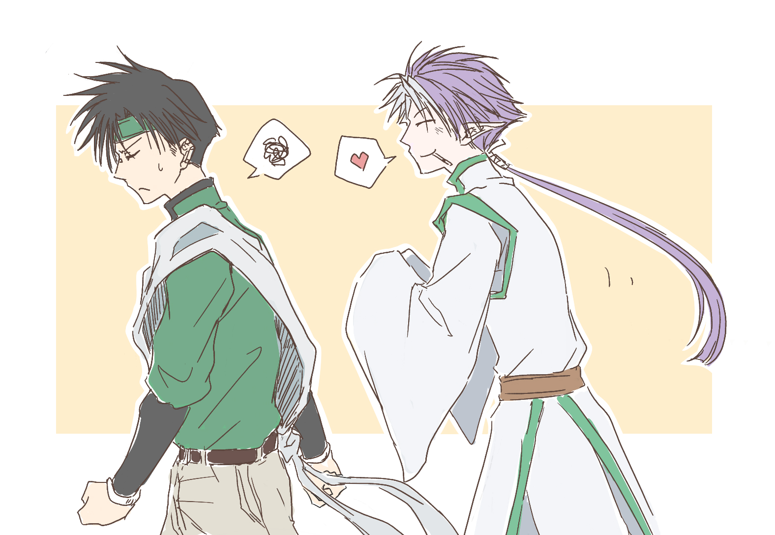 2boys black_hair cho_hakkai heart implied_yaoi long_hair male_focus multiple_boys pointy_ears ponytail profile purple_hair saiyuki short_hair stalking subaru_osu sweatdrop walking wide_sleeves yisou_chin