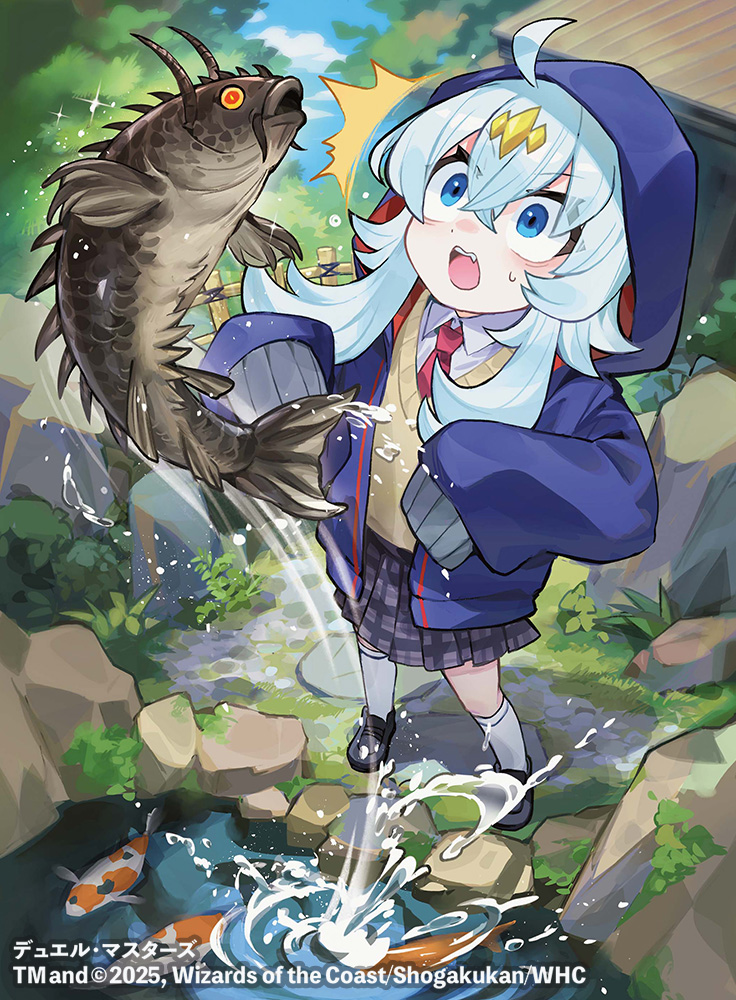 1girl 2025 ^^^ ahoge black_shoes black_skirt blue_eyes blue_jacket copyright_notice crossed_bangs dragon_musume_ni_naritakunai! duel_masters from_above hair_ornament hood hood_up hooded_jacket jacket kneehighs koi koroguchi kumada_suzu long_hair necktie official_art open_clothes open_jacket open_mouth outdoors plaid_clothes plaid_skirt pond red_necktie shirt shoes sidelocks skirt sleeves_past_fingers sleeves_past_wrists socks solo sparkle splashing surprised sweatdrop sweater_vest teeth upper_teeth_only white_shirt white_socks yellow_sweater_vest