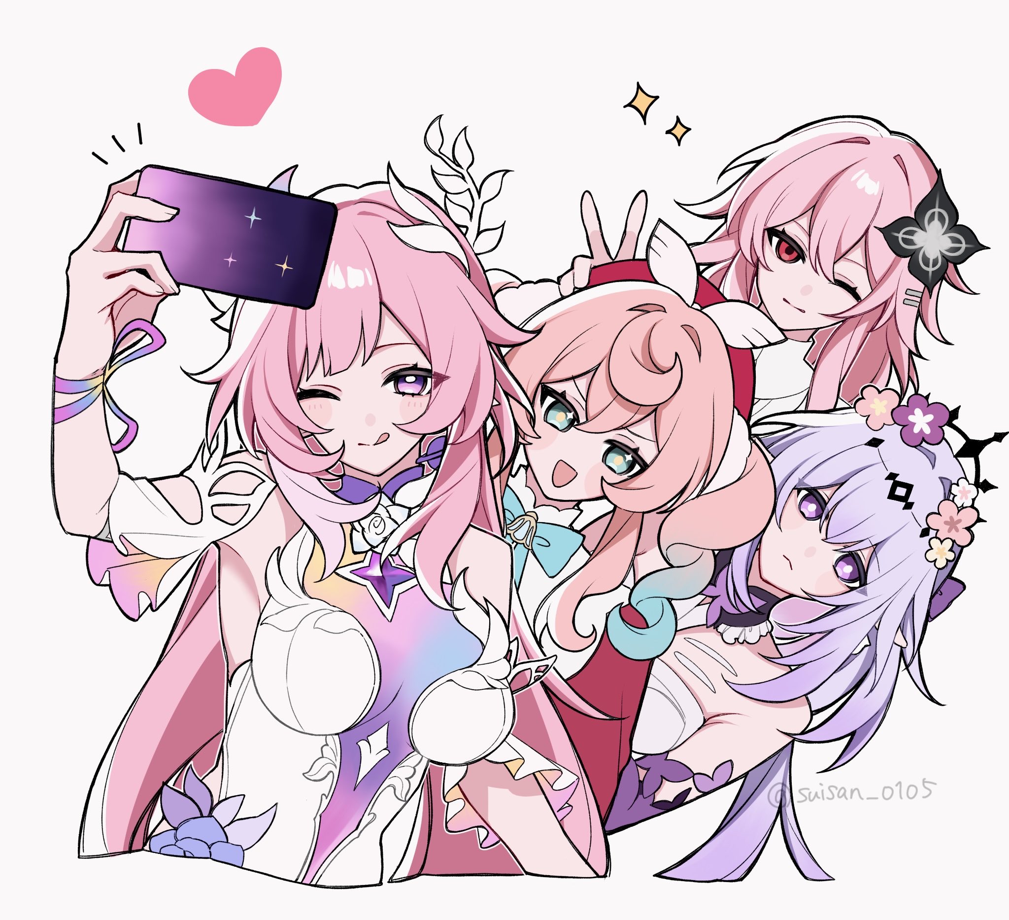 4girls :< alternate_form aqua_eyes aqua_hair arm_up armpits artist_name bare_shoulders black_flower black_tiara blue_bow blue_bowtie blue_dress blue_flower blue_hair blue_rose blush blush_stickers bow bowtie breasts bright_pupils butterfly_ornament castorice_(honkai:_star_rail) cellphone closed_mouth commentary_request cropped_torso cyrene_(demiurge)_(honkai:_star_rail) cyrene_(honkai:_star_rail) detached_sleeves diamond-shaped_pupils diamond_(shape) dress drill_hair earrings empty_eyes evernight_(honkai:_star_rail) fingernails flower fur-trimmed_dress fur_trim gem gradient_hair hair_bow hair_flower hair_ornament hair_ribbon hairclip half-closed_eye hat hat_ornament heart highres holding holding_phone honkai:_star_rail honkai_(series) hyacine_(honkai:_star_rail) jewelry large_breasts leaf_hair_ornament licking_lips long_hair long_sleeves looking_at_phone low_twintails march_7th_(honkai:_star_rail) medium_breasts mobius_strip multicolored_dress multicolored_hair multiple_girls notice_lines one_eye_closed open_mouth pendant phone pink_dress pink_flower pink_hair planet_earrings pointy_ears purple_bow purple_dress purple_eyes purple_gem purple_hair red_dress red_eyes red_hat ribbon rose selfie short_sleeves sidelocks simple_background single_earring sleeveless sleeveless_dress smartphone smile sparkle sparkling_eyes suisan_0105 symbol-shaped_pupils tiara tongue tongue_out turtleneck turtleneck_dress twintails two-tone_hair upper_body v very_long_hair white_background white_dress white_flower white_pupils white_ribbon white_rose white_sleeves yellow_dress yellow_flower yellow_pupils