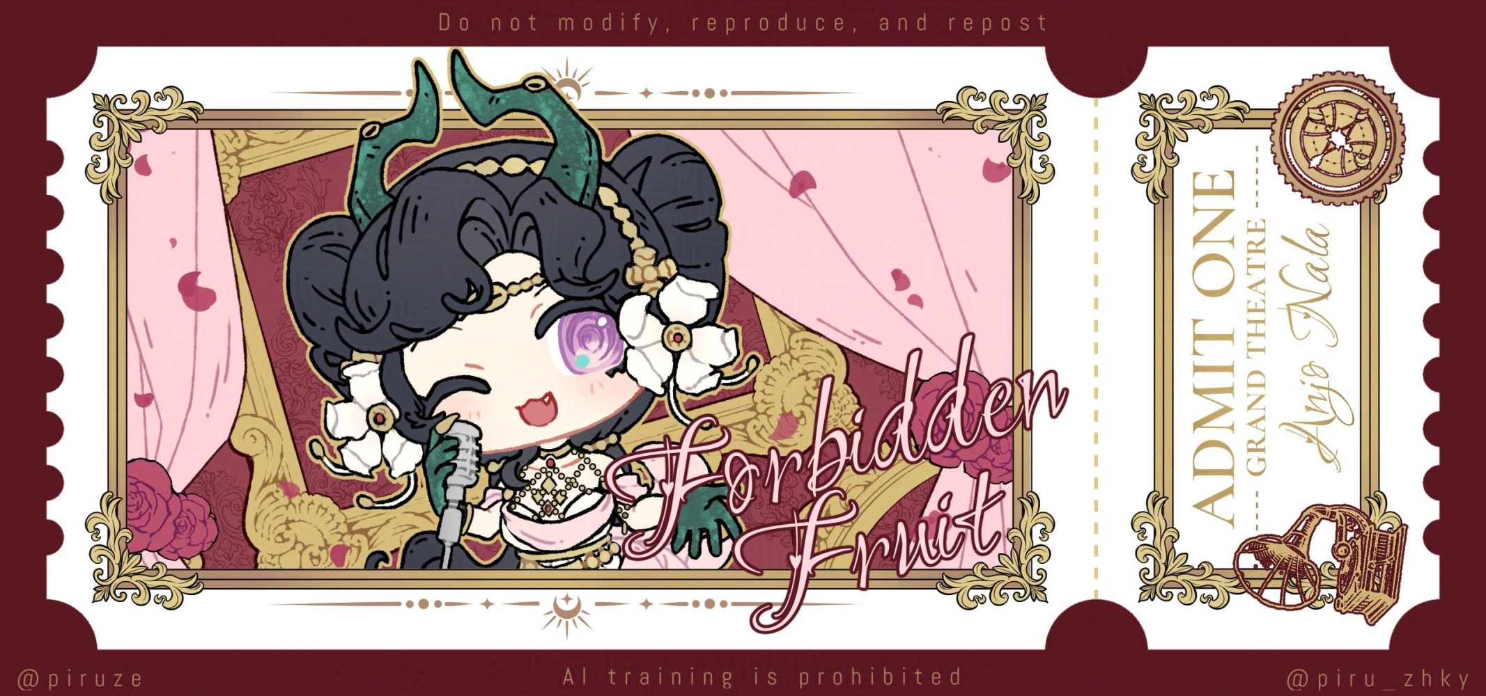 1girl ;d anjo_nala anjo_nala_(forbidden_fruit) black_hair border character_name chibi curtains demon_girl demon_horns dress english_text fang flower gloves green_gloves green_horns hair_flower hair_ornament highres holding holding_microphone_stand horns long_hair microphone_stand official_alternate_costume one_eye_closed open_mouth piruze purple_eyes red_border reverse:1999 smile solo ticket upper_body white_dress white_flower