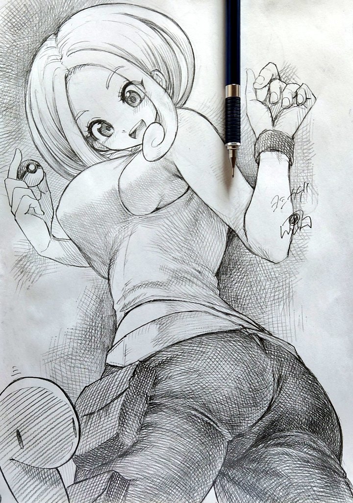 1girl ass breasts butterfly_net camera capri_pants commentary_request gen_2_pokemon hand_net holding holding_camera large_breasts monochrome nintendo open_mouth pants pokemon pokemon_(creature) pokemon_x_and_y shirt short_hair shuckle sketch sleeveless sleeveless_shirt smile tank_top viola_(pokemon) wristband yoshikage_(yo4kage)