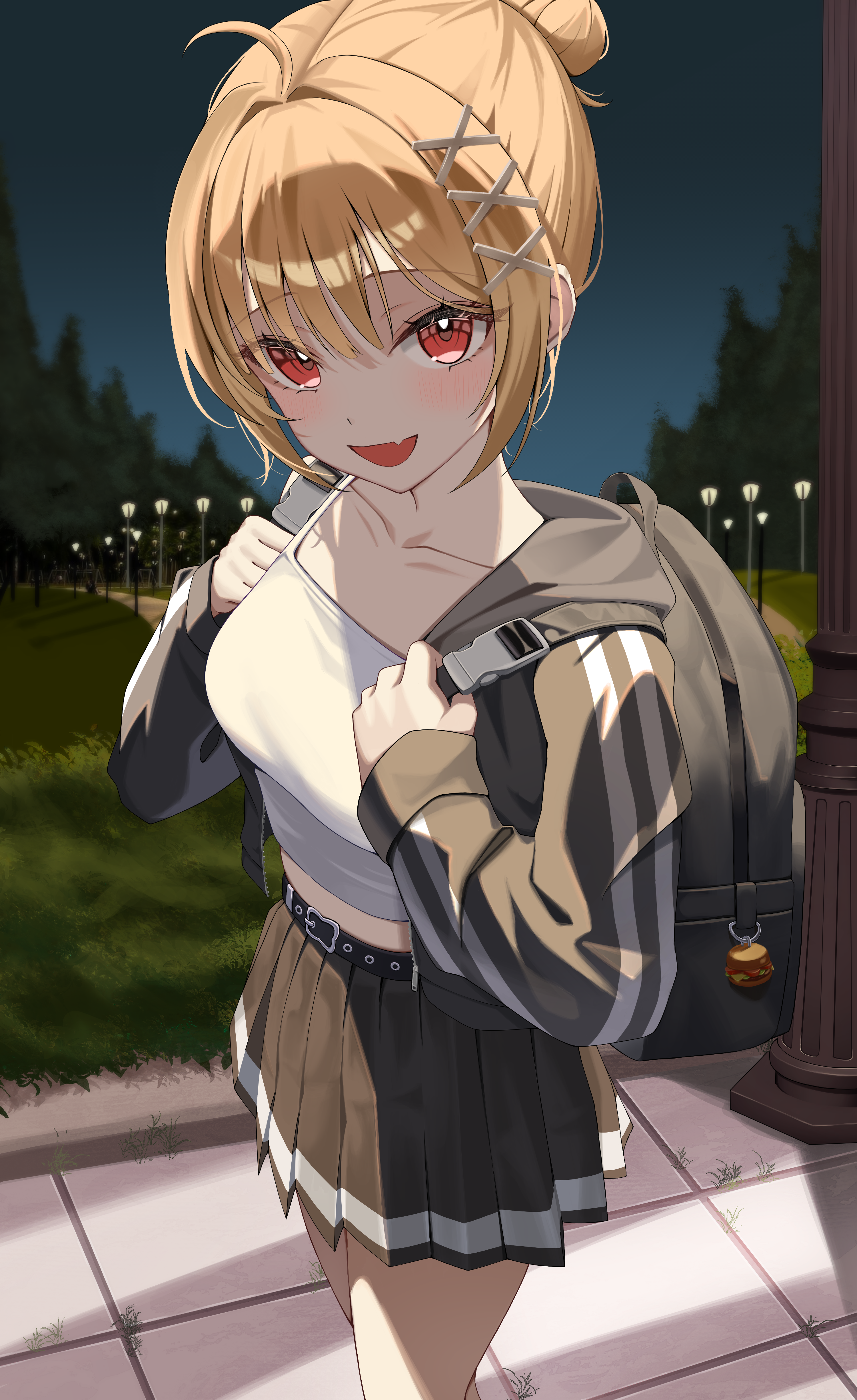 1girl :d absurdres ahoge backpack bag belt black_bag black_belt black_jacket black_skirt blonde_hair blush breasts brown_skirt camisole collarbone commentary cowboy_shot crop_top fang grass hair_bun hair_ornament hairclip hameln highres holding_strap hood hooded_jacket jacket jingburger korean_commentary lamppost long_sleeves looking_at_viewer medium_breasts midriff miniskirt night open_clothes open_jacket open_mouth outdoors pleated_skirt red_eyes shirt short_hair sidelocks single_hair_bun skin_fang skirt sky smile solo spaghetti_strap standing tree virtual_youtuber waktaverse white_camisole white_shirt x_hair_ornament