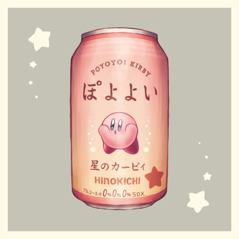 blue_eyes border can character_print commentary_request drink_can food_focus grey_background kirby kirby_(series) nintendo no_humans open_mouth ro2noki star_(symbol) translation_request white_border