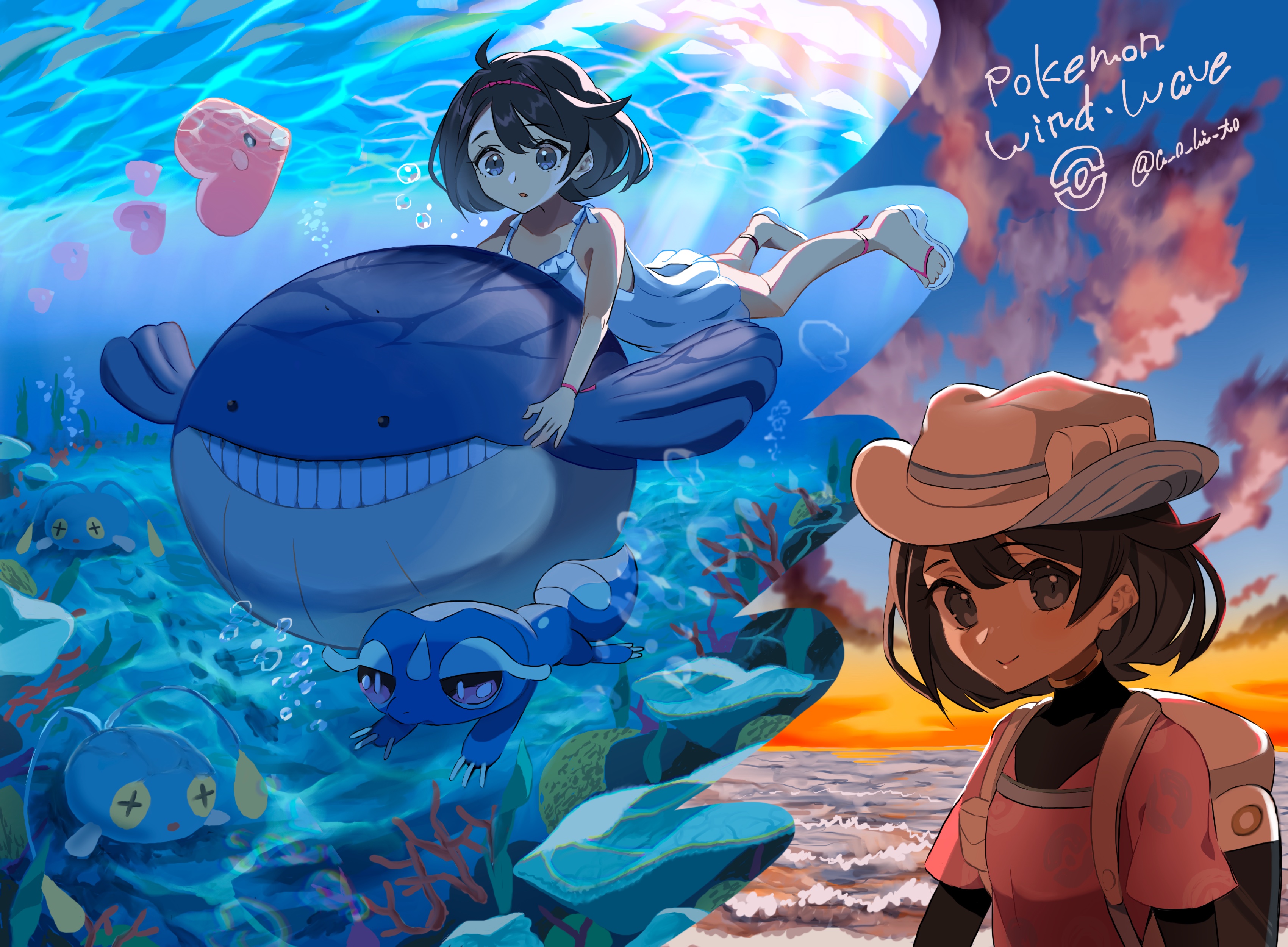 1girl absurdres antennae ao_hito bare_shoulders beach black_bodysuit black_hair bodysuit bodysuit_under_clothes chinchou colored_sclera commentary_request coral cross-shaped_pupils dress female_protagonist_(pokemon_ww) fish gecqua gen_2_pokemon gen_3_pokemon grey_eyes hat highres layered_sleeves long_sleeves luvdisc nintendo ocean outdoors pink_shirt pokemon pokemon_(creature) pokemon_winds_and_waves sandals shirt short_hair short_sleeves smile swimming symbol-shaped_pupils teeth underwater wailmer water whale white_dress white_hat yellow_sclera