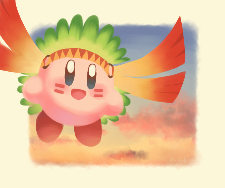1boy :d blue_eyes border cloud commentary_request creature facial_mark flying full_body headdress kirby kirby_(series) looking_at_viewer male_focus native_american_clothes native_american_headdress nintendo no_humans open_mouth outside_border ro2noki sky smile solo wing_kirby wings yellow_border