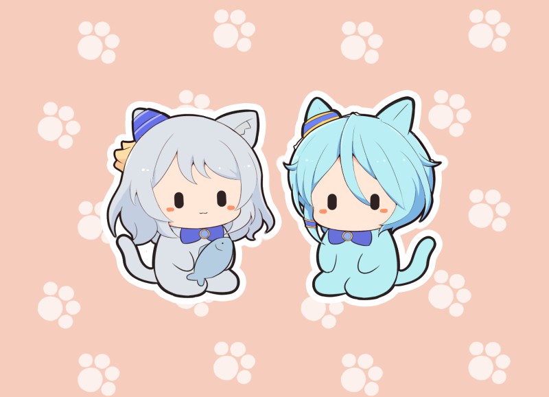 2girls :3 animal animal_costume animal_ear_fluff animal_ears blush_stickers brown_background cat_costume cat_ears cat_tail chibi closed_mouth commentary_request fish gomashio_(goma_feet) hishi_miracle_(umamusume) holding holding_animal k.s.miracle_(umamusume) kemonomimi_mode multiple_girls outline paw_print paw_print_background sitting tail umamusume white_outline |_|