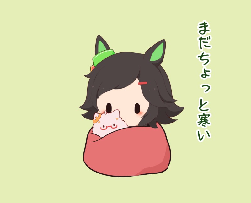 1girl animal_ears biwa_hayahide_(umamusume) black_hair blush_stickers chibi commentary_request glasses gomashio_(goma_feet) green_background hair_ornament hairclip horse_ears red-framed_eyewear semi-rimless_eyewear simple_background swept_bangs translation_request umamusume under-rim_eyewear winning_ticket_(umamusume) wrapped_in_blanket |_|