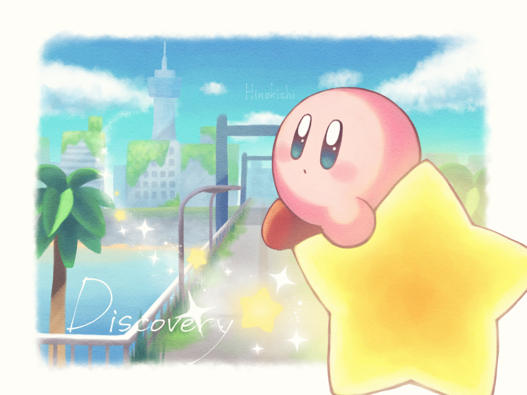 1boy blue_eyes blue_sky blush_stickers city closed_mouth cloud commentary_request creature dot_mouth full_body kirby kirby_(series) male_focus nintendo no_humans outdoors palm_tree ro2noki sky solo star_(symbol) tree