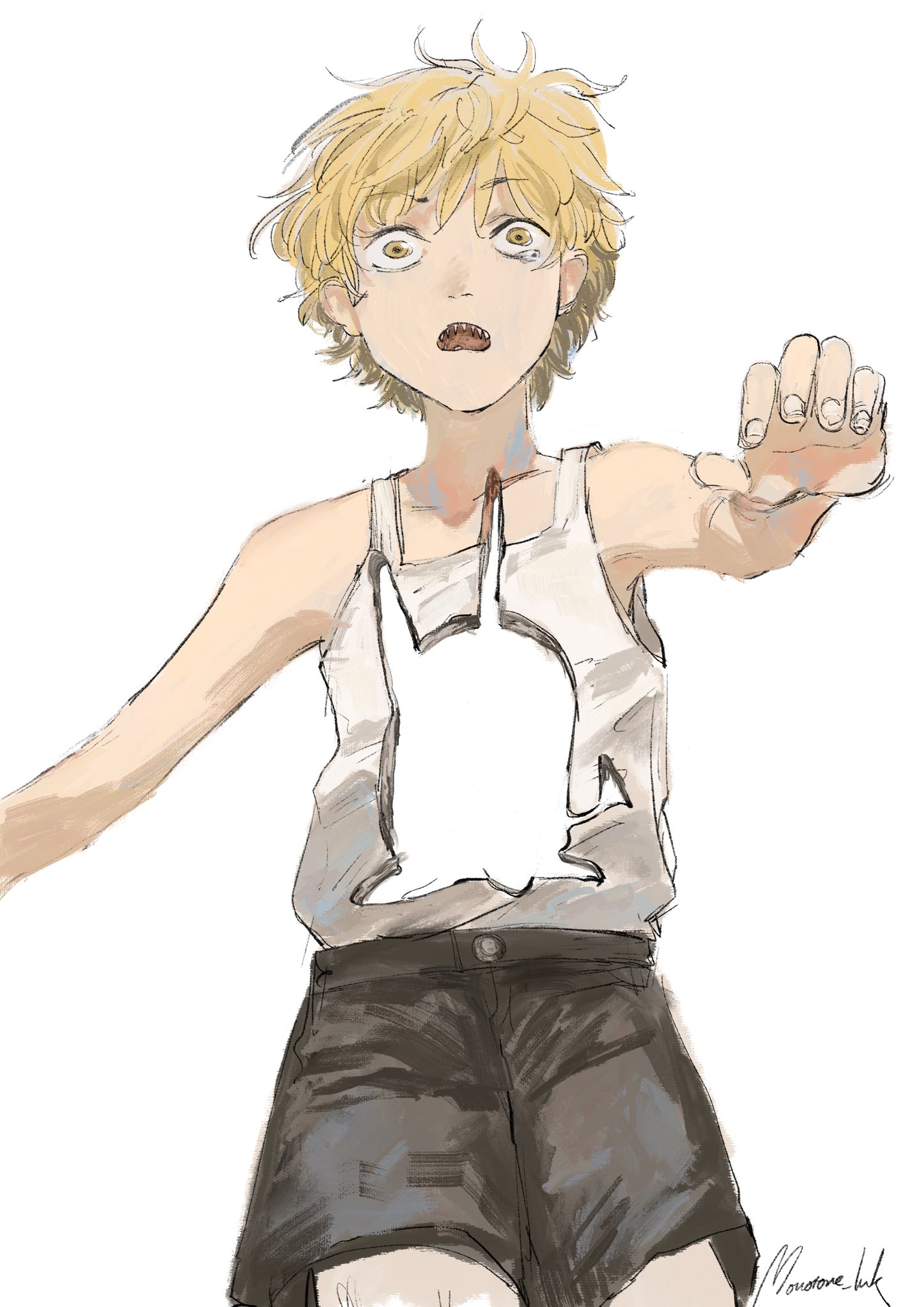 1boy aged_down blonde_hair chainsaw_man child cowboy_shot denji_(chainsaw_man) highres hole_in_chest hole_on_body monotone_ink pochita_(chainsaw_man) sad sharp_teeth short_hair shorts signature simple_background tank_top tearing_up teeth waving white_background white_tank_top yellow_eyes