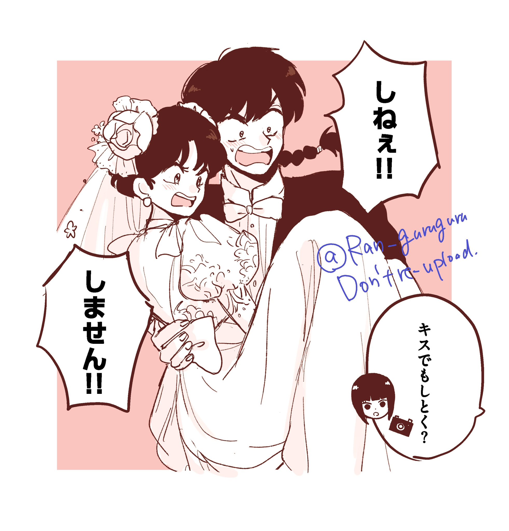 bow bowtie braid bride camera carrying commentary_request dress earrings flower groom hair_flower hair_ornament highres husband_and_wife jewelry juliet_sleeves long_sleeves monochrome open_mouth princess_carry puffy_sleeves ranma_1/2 saotome_ranma short_hair shouting single_braid speech_bubble tendou_akane tendou_nabiki tori_(runrunpiia) translation_request tuxedo v-shaped_eyebrows veil wedding wedding_dress