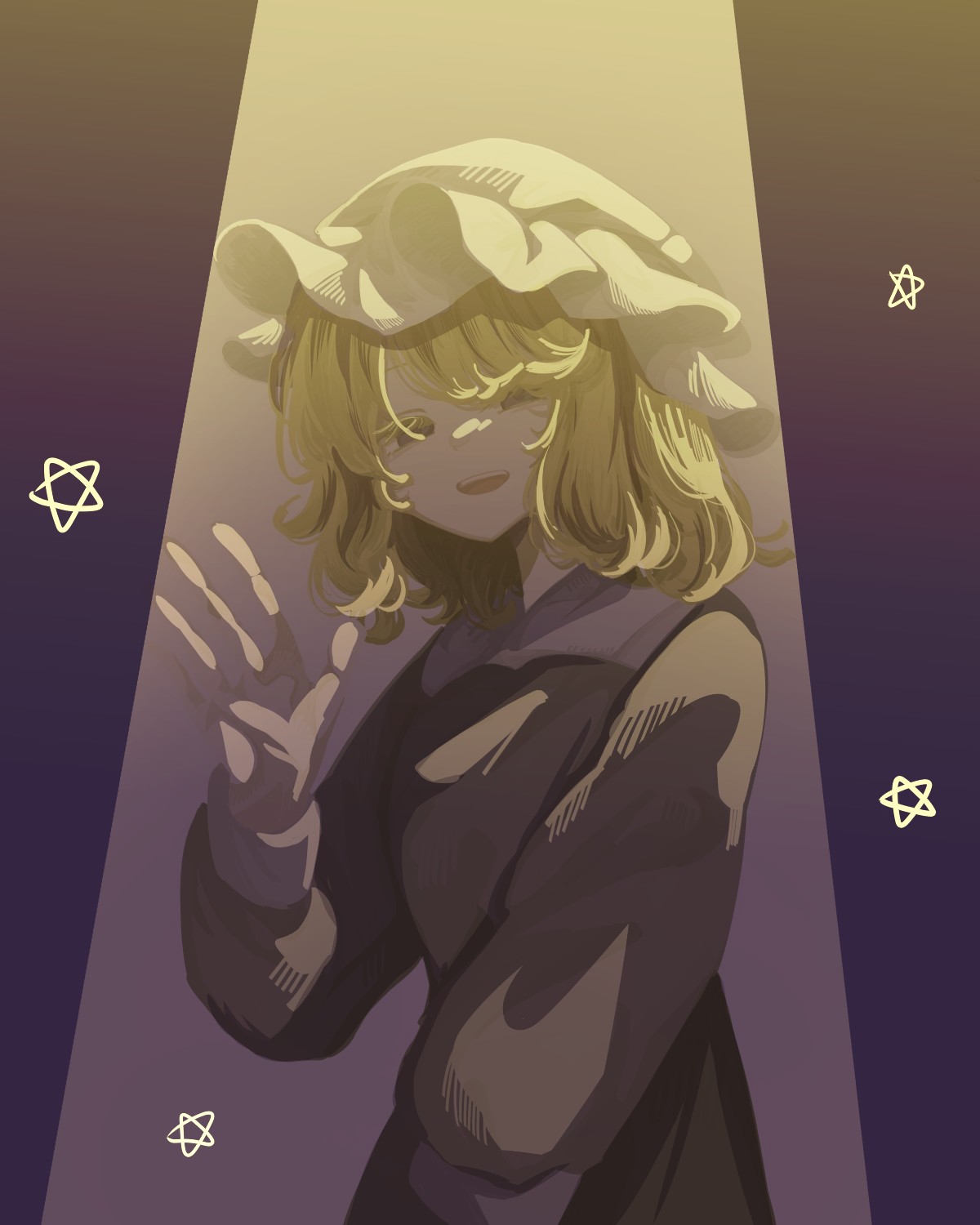 1girl blonde_hair collared_dress commentary dress hat highres large_hands long_sleeves maribel_hearn medium_hair mob_cap open_mouth puffy_long_sleeves puffy_sleeves purple_dress purple_eyes sleeve_cuffs solo spotlight star_(symbol) swept_bangs teeth touhou ugetsu upper_teeth_only waving white_hat