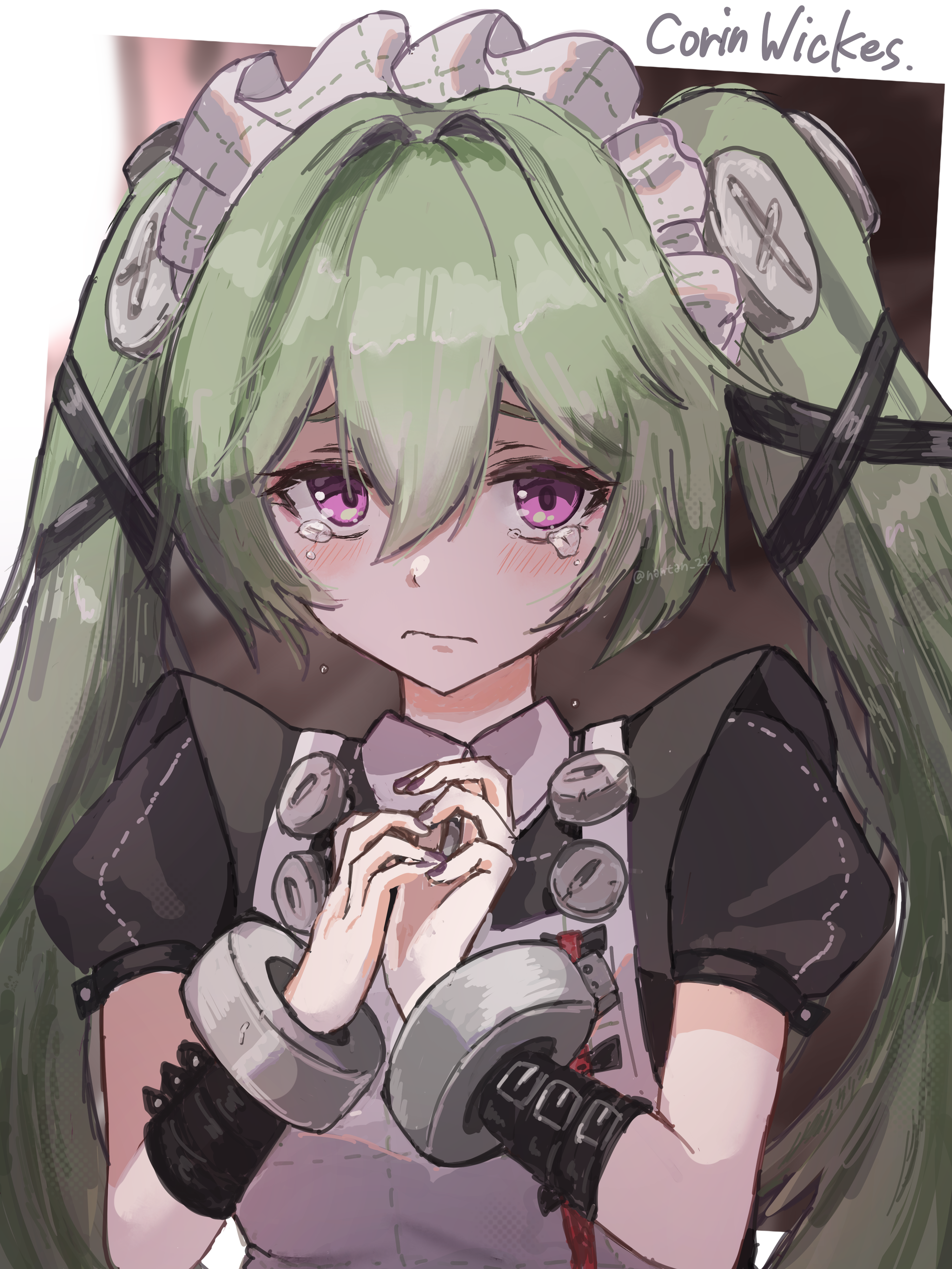 1girl absurdres black_dress black_nails blush character_name closed_mouth commentary_request corin_wickes dress green_hair hair_between_eyes hands_up highres long_hair looking_at_viewer maid maid_headdress metal_wrist_cuffs mirimiri21 purple_eyes screw_hair_ornament solo tears twintails upper_body zenless_zone_zero