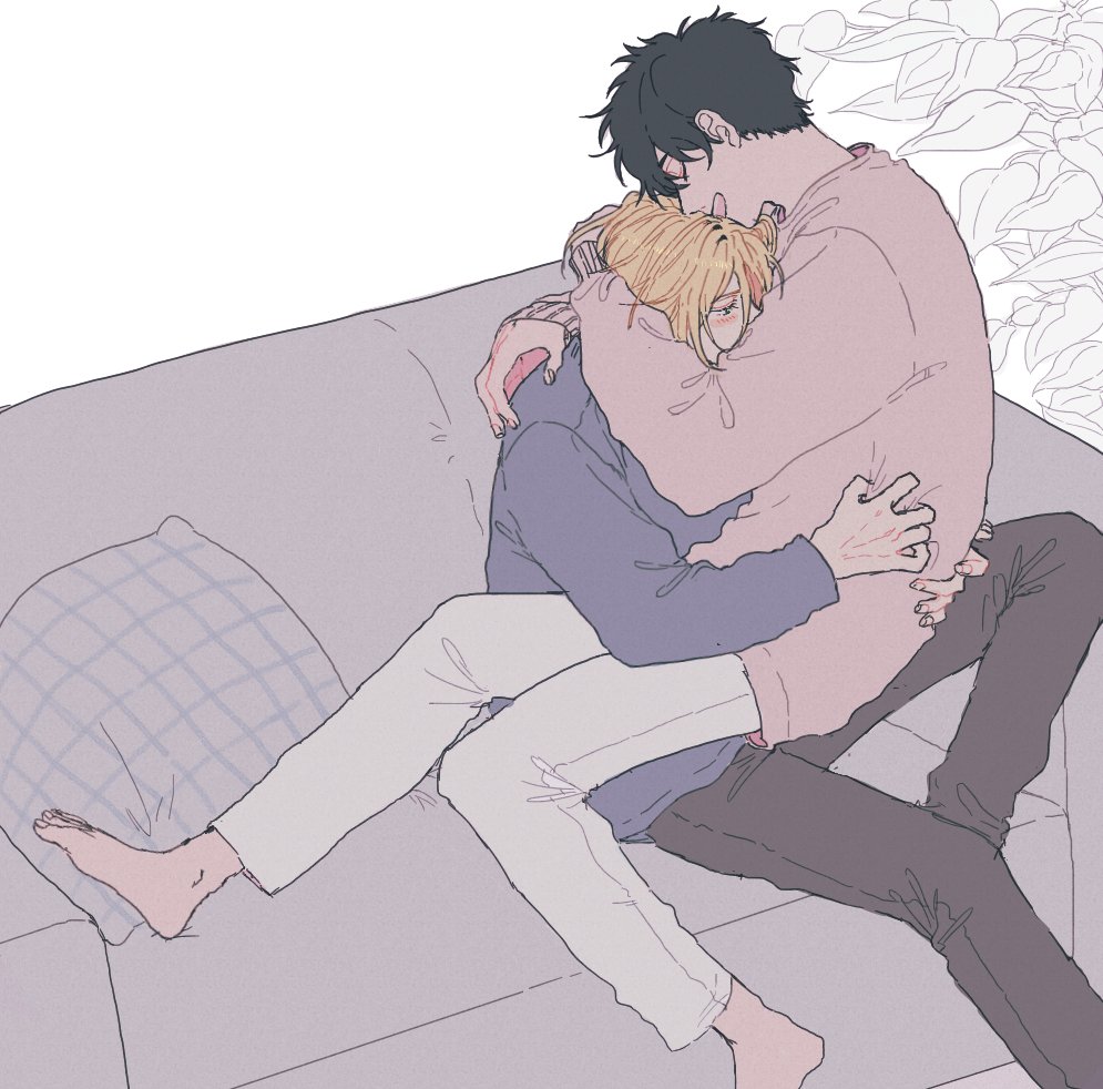 2boys a_co_pi arms_around_neck ash_lynx banana_fish barefoot black_hair black_pants blonde_hair blue_eyes blue_shirt closed_eyes commentary_request couch hug long_sleeves male_focus multiple_boys mutual_hug okumura_eiji open_mouth pants parted_bangs pillow pink_shirt plant shirt short_hair sitting sitting_on_lap sitting_on_person smile white_background white_pants yaoi