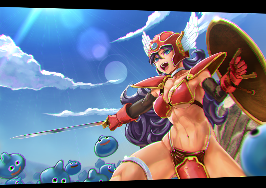 1girl abazu-red abs armor bikini_armor blue_eyes blue_gem blue_skin blue_sky breasts choker chromatic_aberration cloud collarbone colored_skin commentary_request curly_hair day dragon_quest dragon_quest_iii elbow_gloves eyelashes feathered_helmet gem gloves hair_between_eyes helmet holding holding_shield holding_sword holding_weapon jeweled_helmet large_breasts lens_flare letterboxed light_rays long_hair mountainous_horizon muscular muscular_female navel open_mouth outdoors partial_commentary pelvic_curtain purple_hair red_armor red_gloves rock shield shoulder_armor sky slime_(creature) slime_(dragon_quest) smile sunbeam sunlight sword teeth thick_thighs thighs warrior warrior_(dq3) weapon