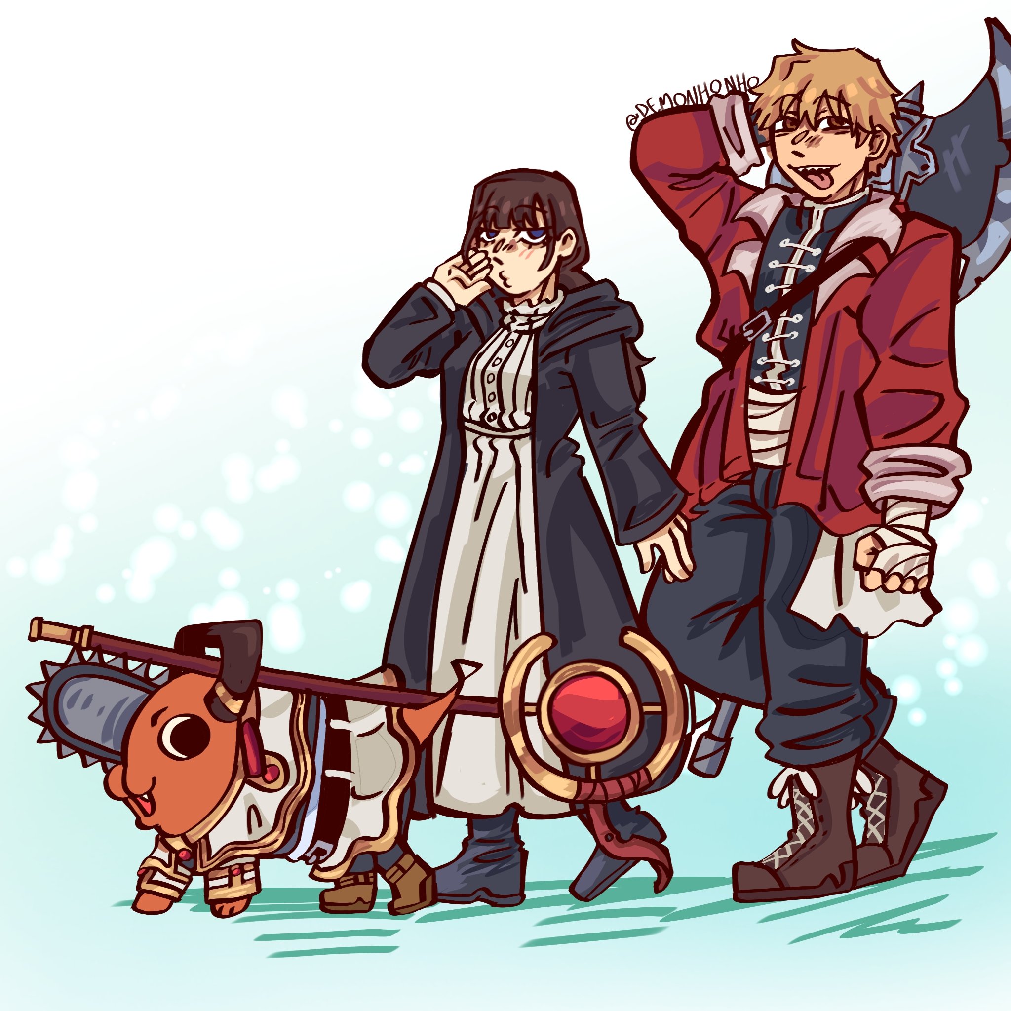 1boy 1girl axe black_eyes black_shoes blonde_hair blue_eyes brown_hair brown_shoes chainsaw chainsaw_man coat colored_skin commentary demonhonho denji_(chainsaw_man) dog dress earrings english_commentary fern_(adventure_time) fern_(sousou_no_frieren) frieren hand_on_own_face highres jewelry long_hair mage_staff mitaka_asa open_mouth orange_skin pants pochita_(chainsaw_man) red_coat sharp_teeth shoes short_hair sousou_no_frieren staff teeth tongue tongue_out weapon white_dress yellow_eyes