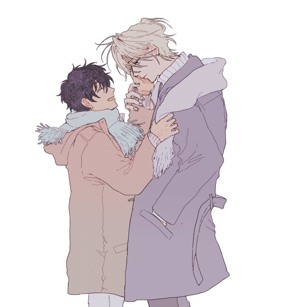 2boys a_co_pi arms_up ash_lynx banana_fish black_hair blonde_hair blue_coat brown_jacket closed_eyes closed_mouth coat commentary_request from_side grey_pants grey_scarf hand_in_pocket hand_on_another's_face hood hood_down hooded_jacket jacket long_sleeves looking_at_another male_focus multiple_boys okumura_eiji open_mouth pants scarf simple_background smile standing white_background white_pants white_scarf yaoi