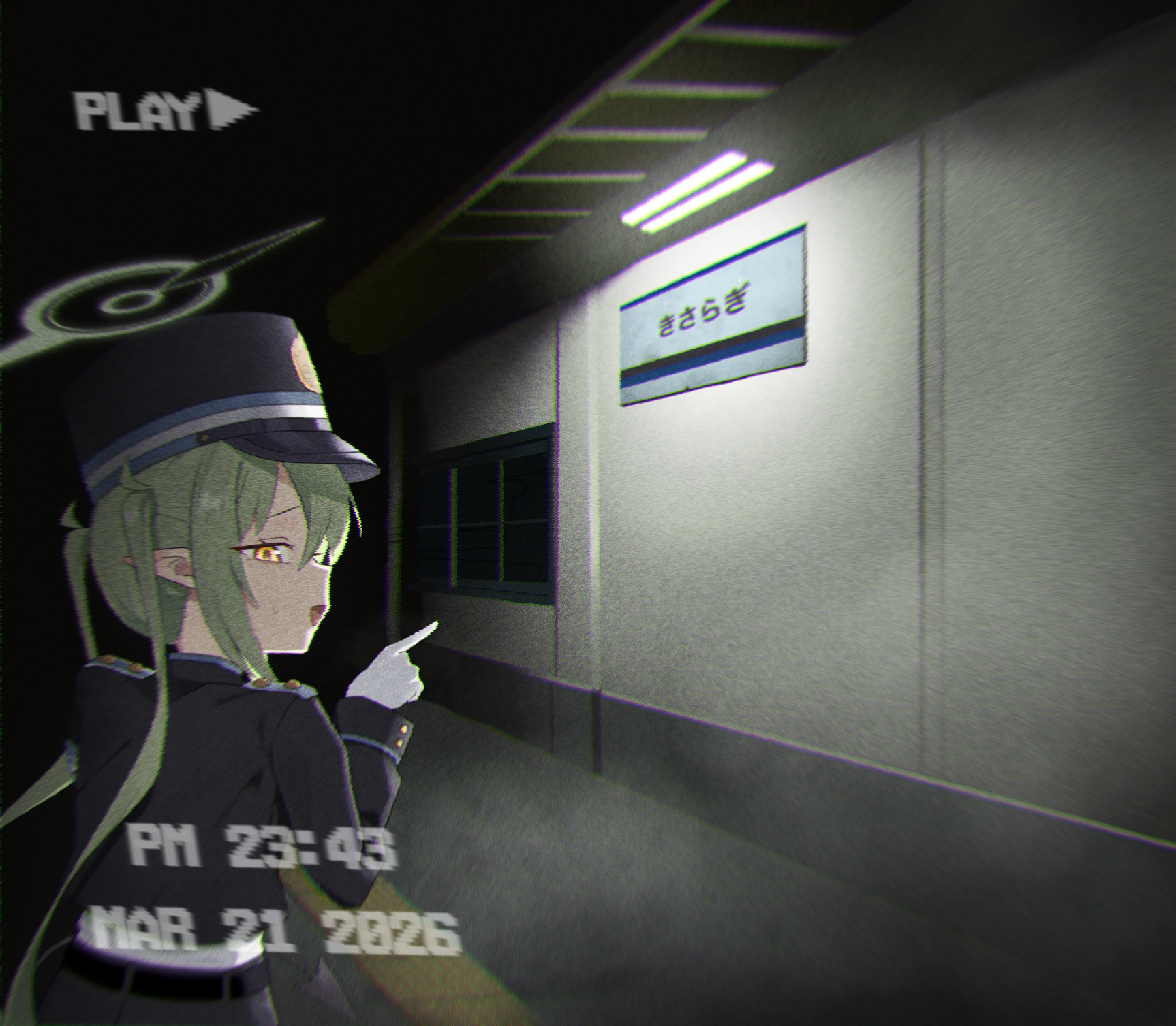 1girl blue_archive commentary_request gloves green_hair green_halo halo highres kisaragi_station long_hair long_sleeves nozomi_(blue_archive) pointy_ears solo toughman train_conductor twintails very_long_hair white_gloves yellow_eyes