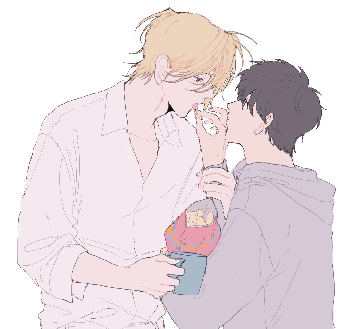 2boys a_co_pi ash_lynx bag_of_chips banana_fish black_hair blonde_hair blue_eyes coffee_mug collared_shirt commentary_request cup eye_contact feeding grey_hoodie hair_behind_ear hand_on_another's_wrist holding holding_cup hood hood_down hoodie long_sleeves looking_at_another male_focus medium_hair mug multiple_boys okumura_eiji open_collar open_mouth parted_bangs shirt short_hair simple_background tongue tongue_out upper_body white_background white_shirt wing_collar yaoi