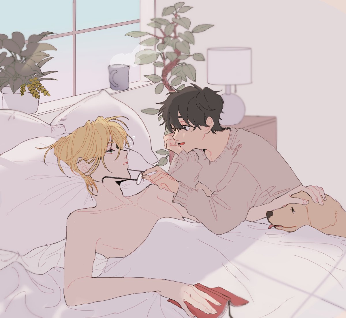 2boys a_co_pi animal ash_lynx banana_fish bedroom black_hair blonde_hair book brown_eyes chest_of_drawers coffee_mug commentary_request crew_neck cup dog eye_contact glasses golden_retriever grey_sweater hand_on_another's_head head_rest holding holding_removed_eyewear indoors lamp long_sleeves looking_at_another male_focus mug multiple_boys okumura_eiji open_book open_mouth parted_bangs parted_lips pillow plant potted_plant removing_eyewear sleeping squeans sweater topless_male under_covers unworn_eyewear yaoi