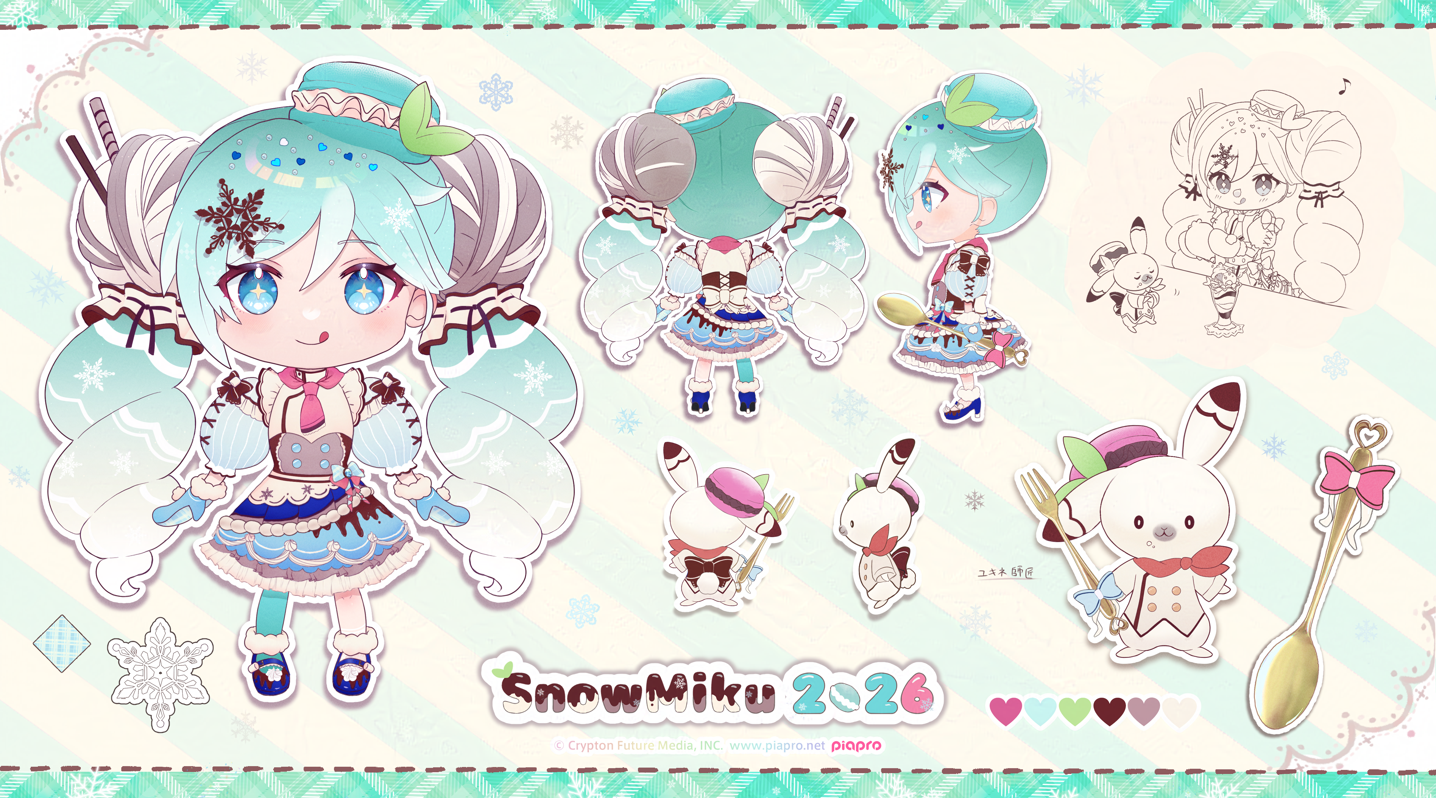 1girl :q absurdres aqua_eyes aqua_hair back_bow black_hair blue_mittens blue_shoes bow character_name chibi chibi_only color_guide commentary_request company_name copyright_notice cross-shaped_pupils dress flaw_(4lmnis) food food-themed_hair_ornament gradient_hair hair_ornament hatsune_miku heart highres looking_at_viewer macaron_hair_ornament mittens multicolored_hair multiple_views musical_note parfait puffy_sleeves rabbit_yukine reference_sheet shoes snowflakes spoon streaked_hair symbol-shaped_pupils tongue tongue_out translation_request twintails vocaloid white_bow white_hair yuki_miku yuki_miku_(2026)_(applicant)