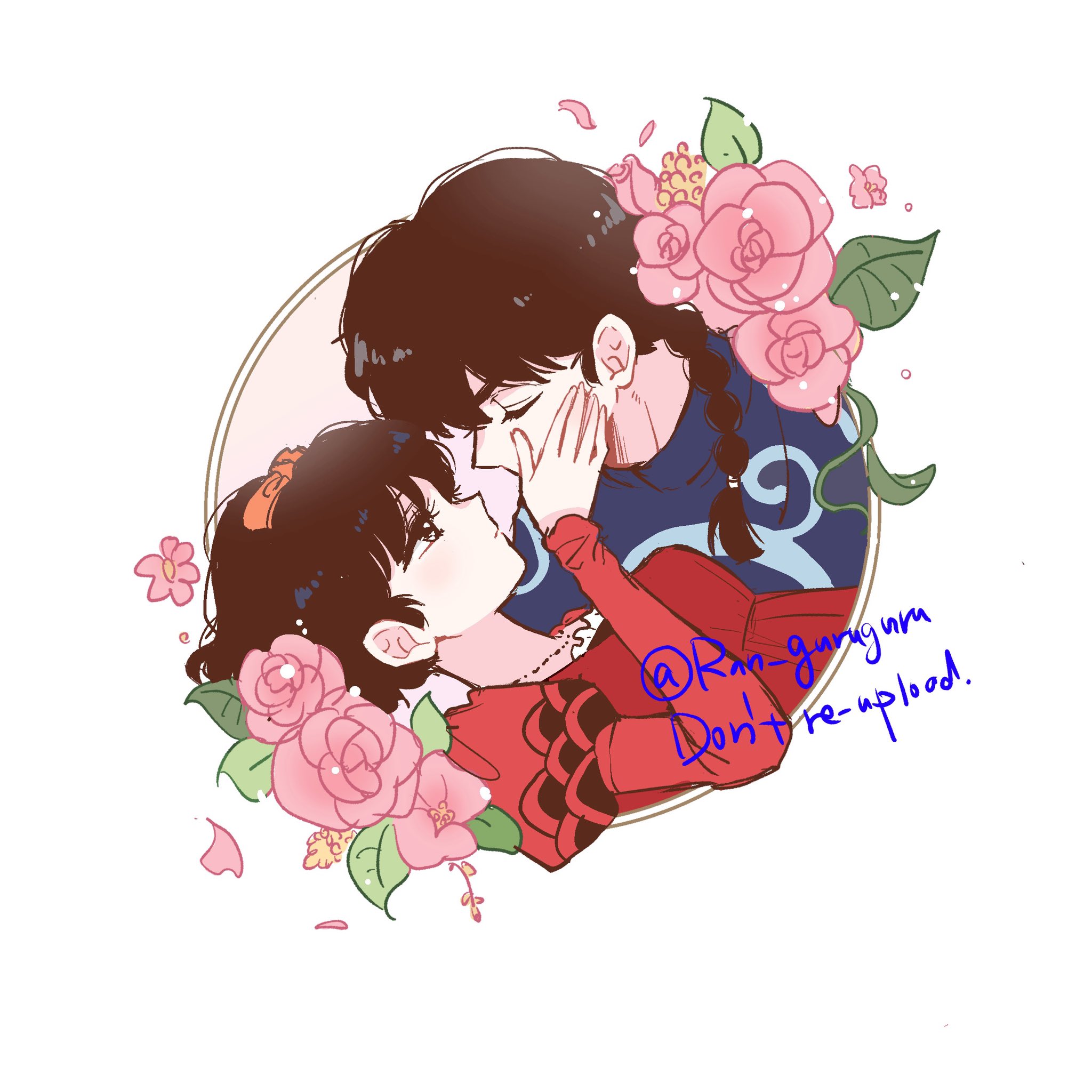 1boy 1girl black_hair blue_dress braid closed_eyes commentary cosplay dress flower hand_on_another's_cheek hand_on_another's_face hetero highres imminent_kiss juliet_capulet juliet_capulet_(cosplay) juliet_sleeves long_sleeves pink_flower puffy_sleeves ranma_1/2 saotome_ranma short_hair single_braid tendou_akane tori_(runrunpiia) untranslatable_commentary