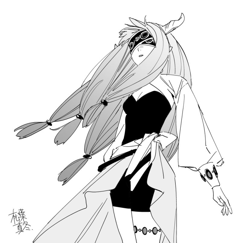 1girl blindfold blindfold_mask braid commentary_request demon demon_girl demon_horns greyscale horns long_hair mask matsuba_000 monochrome multiple_braids skirt sousou_no_frieren zorida_(sousou_no_frieren)