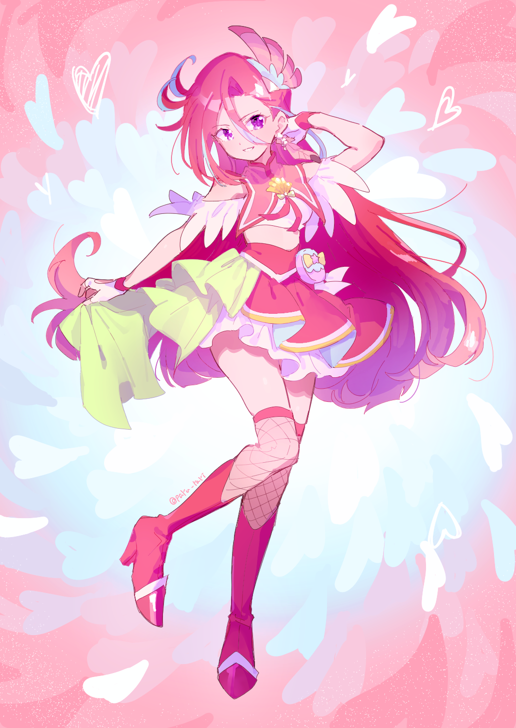 1girl blue_hair boots brooch closed_mouth clothing_cutout commentary cure_flamingo earrings feather_earrings feather_hair_ornament feathers fingerless_gloves fishnet_thighhighs fishnets frilled_shirt frilled_skirt frills full_body gloves green_skirt hair_between_eyes hair_ornament hand_in_own_hair heart highres jewelry knee_boots layered_skirt long_bangs long_hair looking_at_viewer magical_girl midriff miniskirt multicolored_hair pact_holder precure purple_eyes red_background red_boots red_hair red_shirt red_skirt serizawa_serizane shell_brooch shirt short_sleeves shoulder_cutout showgirl_skirt skirt smile solo standing standing_on_one_leg streaked_hair takizawa_asuka thighhighs tropical-rouge!_precure twitter_username two-tone_hair two-tone_skirt very_long_hair white_gloves