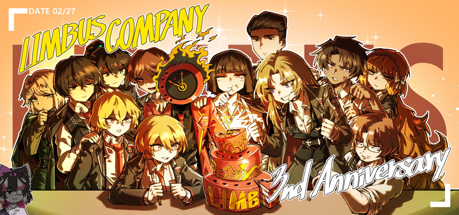6+boys 6+girls anniversary black_coat black_hair black_jumpsuit blonde_hair blue_eyes brown_eyes brown_hair cake clock coat collared_shirt copyright_name dante_(limbus_company) don_quixote_(project_moon) eating ehdbs1198 faust_(project_moon) fire food fork green_eyes gregor_(project_moon) heathcliff_(project_moon) highres hong_lu_(project_moon) ishmael_(project_moon) jumpsuit limbus_company long_hair meursault_(project_moon) multiple_boys multiple_girls neckerchief object_head orange_hair outis_(project_moon) project_moon red_neckerchief rodion_(project_moon) ryoshu_(project_moon) schna_jang shirt short_hair sinclair_(project_moon) sparkle table very_long_hair white_hair yellow_eyes yi_sang_(project_moon)