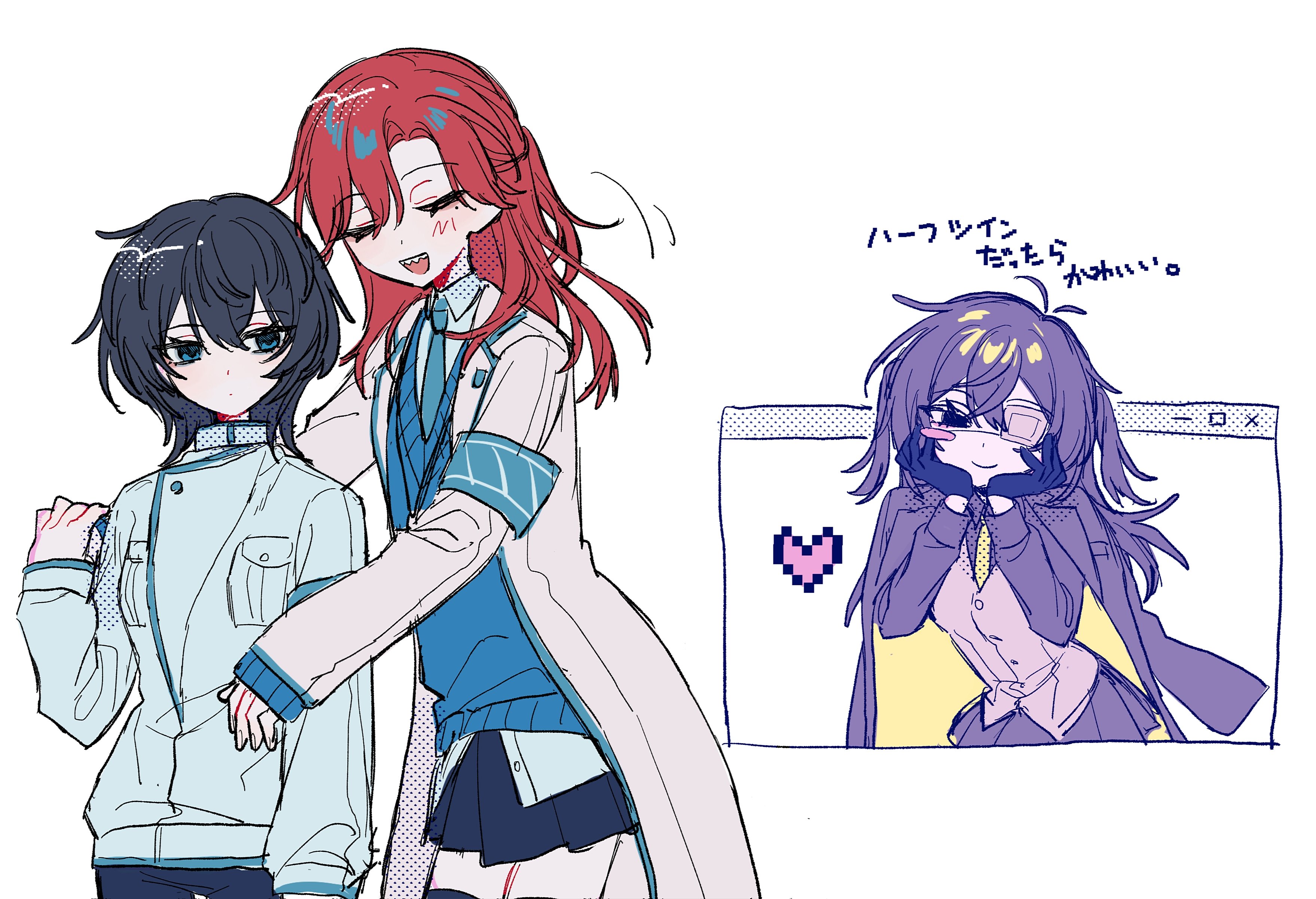 3girls :d absurdres antenna_hair black_hair blue_eyes blue_gloves blue_pants blue_sweater blue_thighhighs breasts closed_mouth coat dot_mouth flat_chest fully_genderswapped_group genderswap genderswap_(mtf) gloves half_updo heart height_difference highres hug hyoutenka_30-do_no_zetsubou kuchinashi_dabi long_hair miniskirt mole mole_under_eye multiple_girls open_mouth pants pixel_heart pleated_skirt purple_hair red_hair ro_ma_ya_su sharp_teeth shirt short_hair skirt small_breasts smile sweater teeth thighhighs tonimura_yui translation_request untucked_shirt white_background white_coat window_(computing) xx_(mitsudomoe_koubou)
