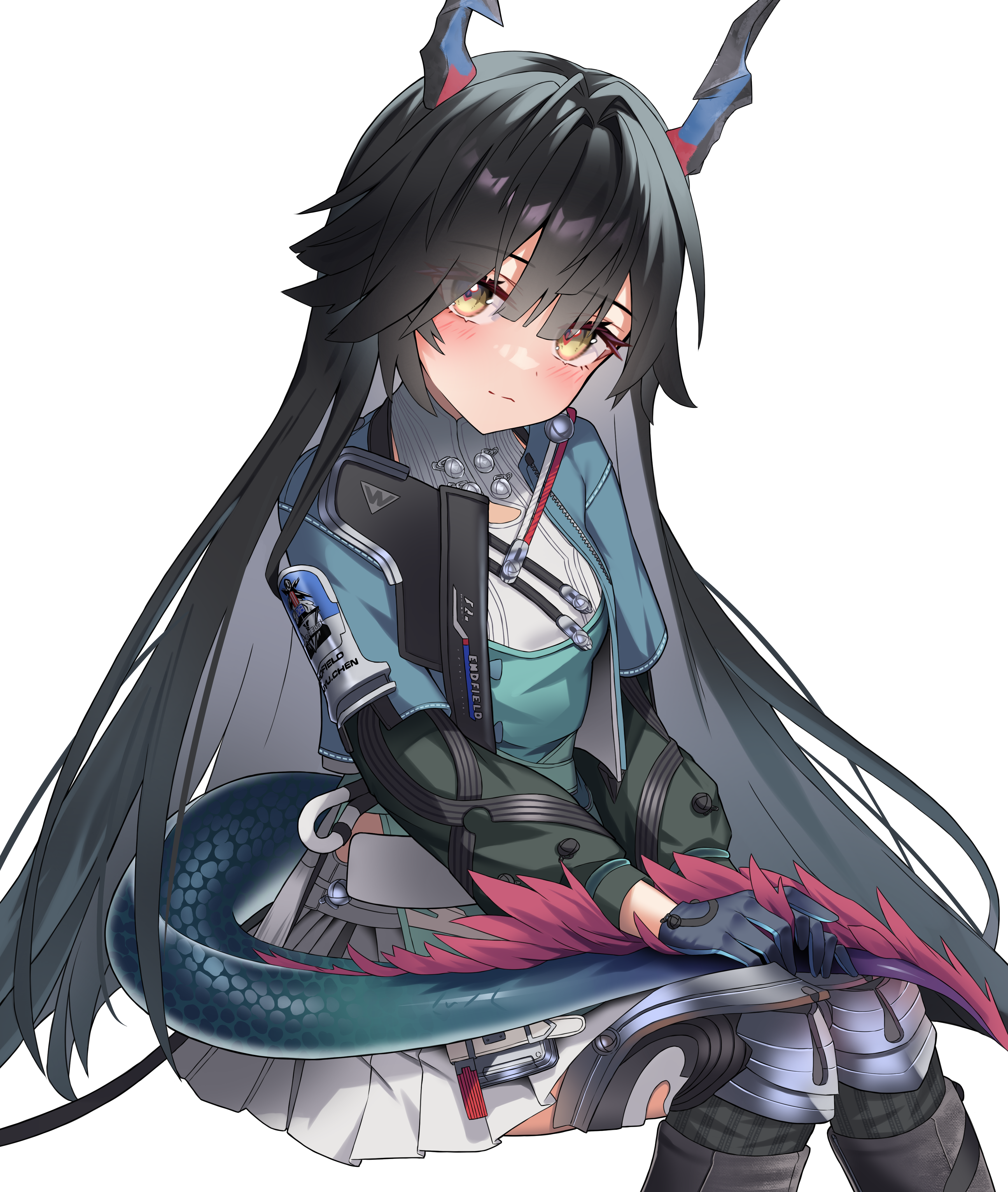1girl above-cleavage_cutout absurdres aqua_shirt arknights arknights:_endfield black_hair blue_jacket blush boots brown_eyes chen_qianyu_(arknights) closed_mouth clothing_cutout commentary cowboy_shot dragon_horns dragon_tail eastern_dragon_horns eastern_dragon_tail gloves grey_skirt hair_between_eyes hair_down head_tilt highres holding_own_tail horns invisible_chair jacket long_hair long_sleeves looking_at_viewer mandarin_collar multicolored_horns multicolored_shirt open_clothes open_jacket partially_feathered_tail pleated_skirt seori shirt simple_background sitting skirt solo tail thigh_boots very_long_hair wavy_mouth white_background white_skirt yellow_eyes