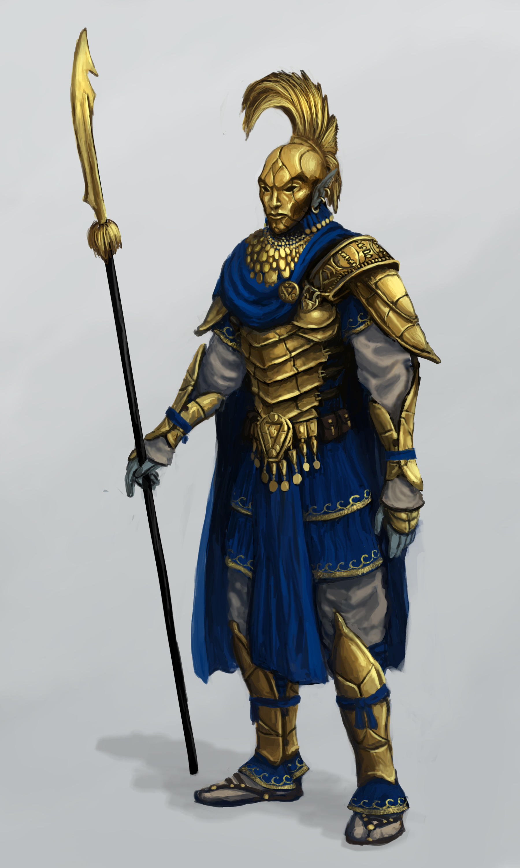 1boy absurdres armor blue_cape blue_loincloth blue_scarf cape colored_skin commentary english_commentary full_body gold_armor gold_bracer gold_weapon grey_background grey_skin highres holding holding_polearm holding_weapon male_focus mohawk ordinator_armor ordinator_guard ordinator_helmet ornate_armor polearm sandals scarf shoulder_armor spear standing swietopelk the_elder_scrolls the_elder_scrolls_iii:_morrowind weapon