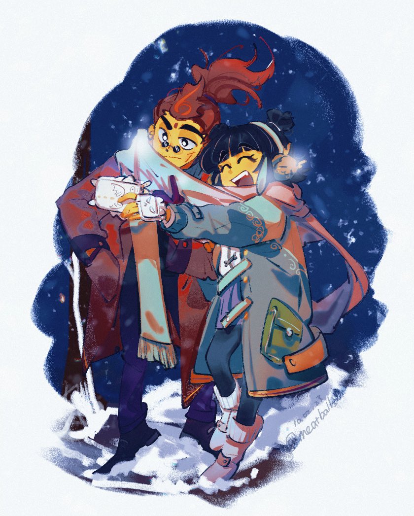 1boy 1girl :d ^_^ alternate_costume animification artist_name black_gloves black_hair black_leggings black_shoes blue_pants blunt_bangs boots breath closed_eyes closed_mouth coat colored_skin commentary double_bun earmuffs facial_mark fangs fingerless_gloves floating_hair forehead_mark fridaystark full_body glasses gloves green_coat green_scarf hair_bun hand_in_pocket hetero holding holding_phone leggings lego_monkie_kid long_sleeves mei_(monkie_kid) open_mouth pants phone pince-nez ponytail purple_skirt red_coat red_hair red_son_(monkie_kid) scarf shared_clothes shared_scarf shoes sidelocks skirt smile snowing standing thick_eyebrows twitter_username untranslatable_commentary v white_boots winter_clothes yellow_skin