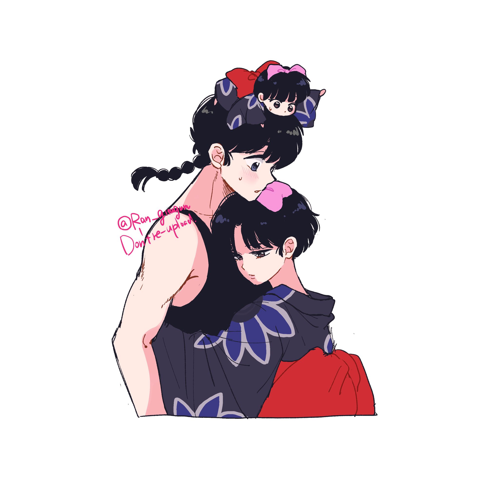 1boy 1girl black_hair black_kimono blush bow braid brown_eyes character_doll character_request doll doll_on_head grey_eyes hair_bow hetero highres japanese_clothes kimono parted_lips pink_bow ranma_1/2 saotome_ranma short_hair single_braid tendou_akane tori_(runrunpiia) upper_body white_background