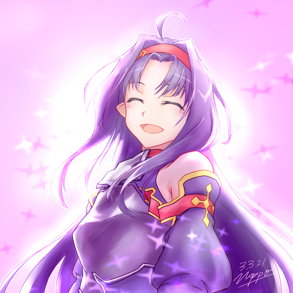 1girl :d ^_^ ahoge armor armpit_crease artist_name bare_shoulders breasts chest_guard closed_eyes commentary commentary_request dated english_commentary facing_viewer floating_hair gradient_background hair_intakes hairband heattech_leotard leotard long_hair long_sleeves mixed-language_commentary no-ppo open_mouth pointy_ears purple_armor purple_background purple_hair purple_leotard purple_sleeves red_hairband red_trim signature small_breasts smile solo sparkle sword_art_online turtleneck upper_body watermark white_background yellow_trim yuuki_(sao)