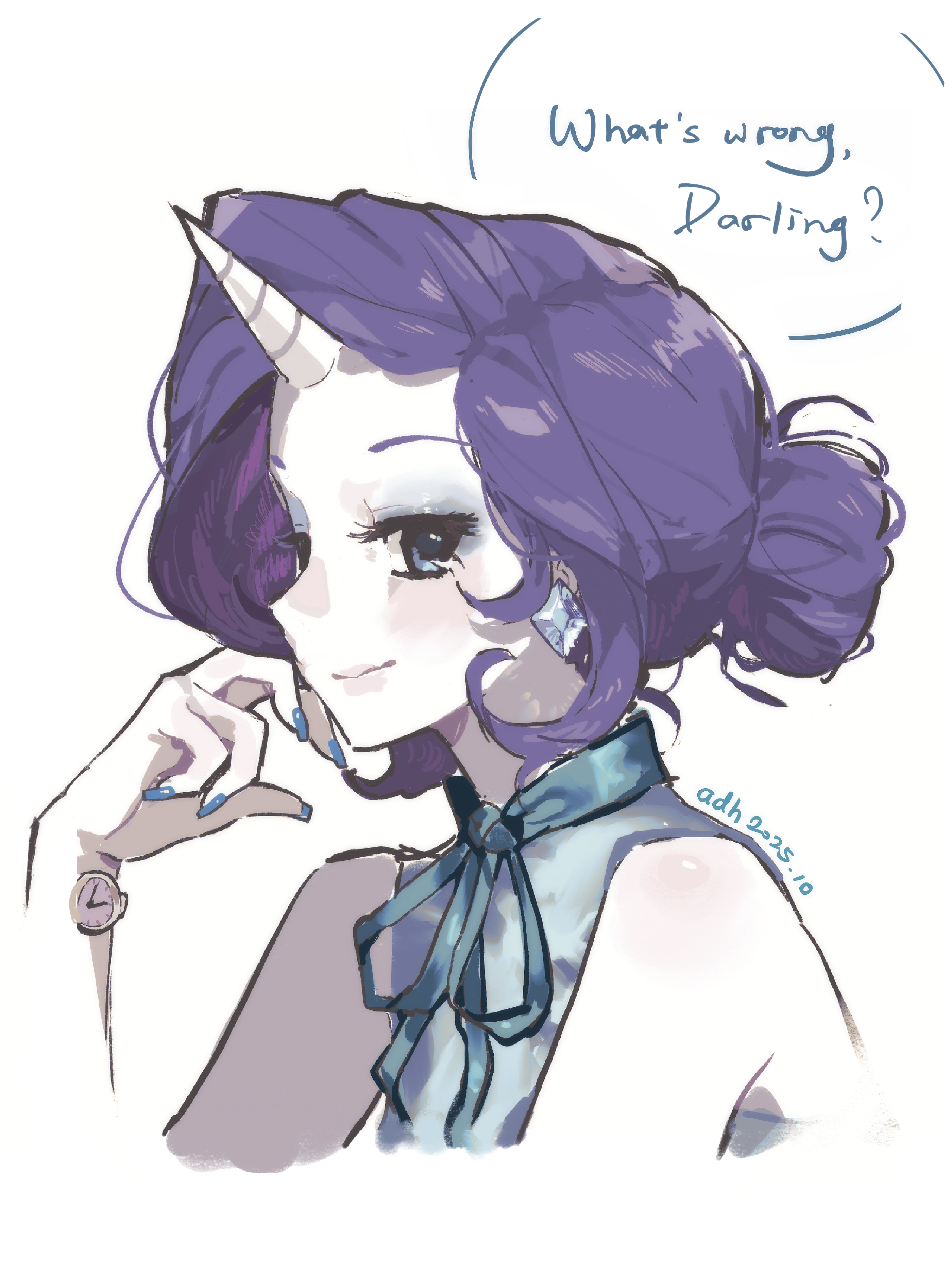 1girl absurdres adh_shi_shei animification bare_shoulders blue_eyes blue_eyeshadow blue_nails blue_ribbon blue_shirt blush colored_skin cropped_shoulders crystal_earrings dated earrings english_text eyeshadow from_side hair_bun highres jewelry looking_at_viewer makeup medium_hair my_little_pony my_little_pony:_equestria_girls my_little_pony:_friendship_is_magic neck_ribbon profile purple_hair rarity_(equestria_girls) rarity_(my_little_pony) ribbon shirt signature simple_background single_hair_bun sleeveless sleeveless_shirt smile solo unicorn_girl unicorn_horn variant_set watch white_background white_skin wristwatch