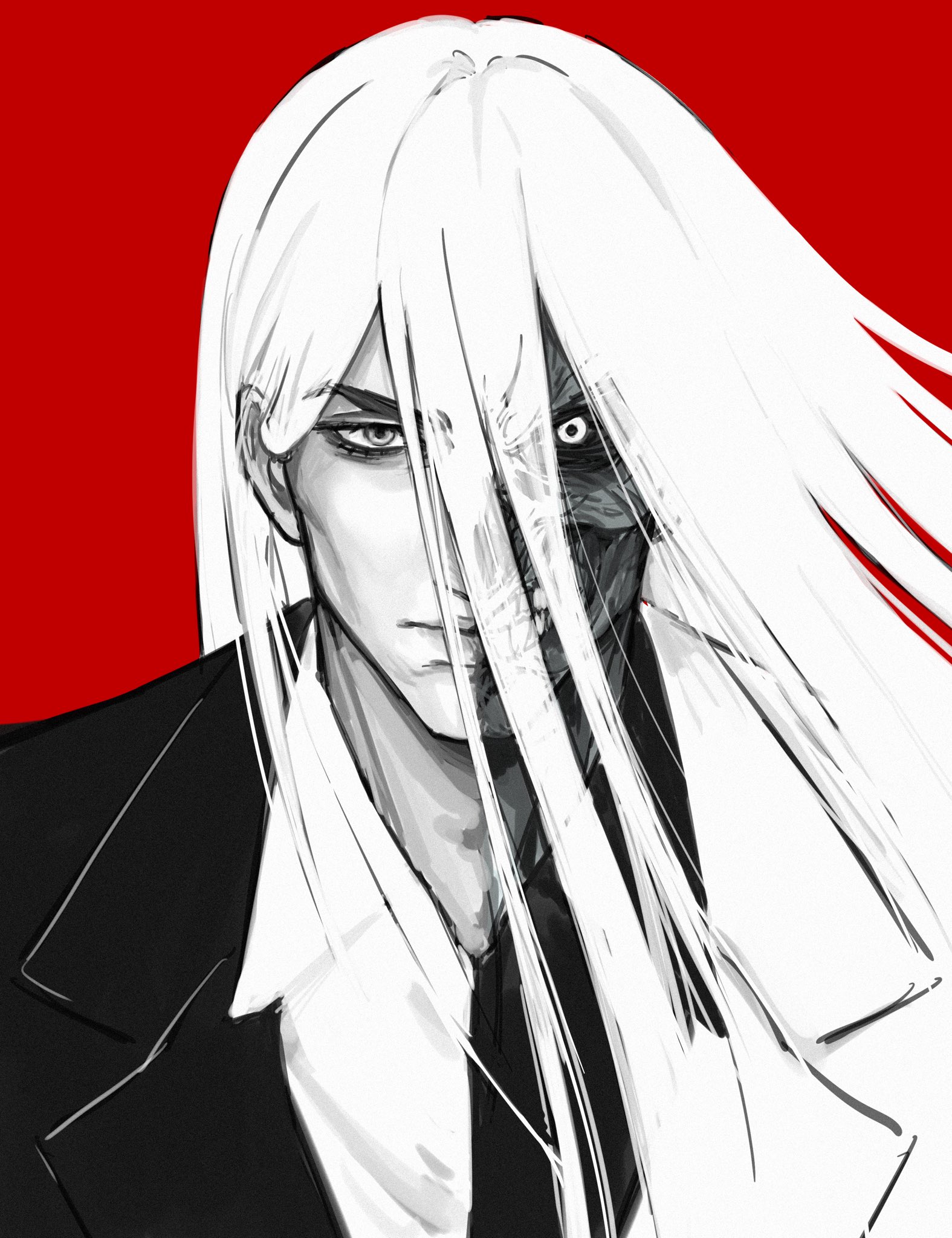 1boy absolute_batman absolute_dc commentary dc_comics english_commentary greyscale_with_colored_background hair_between_eyes highres homyaitaro jacket long_hair looking_at_viewer male_focus multicolored_jacket portrait solo two-face two-face_(absolute_dc) two-tone_jacket two-tone_shirt