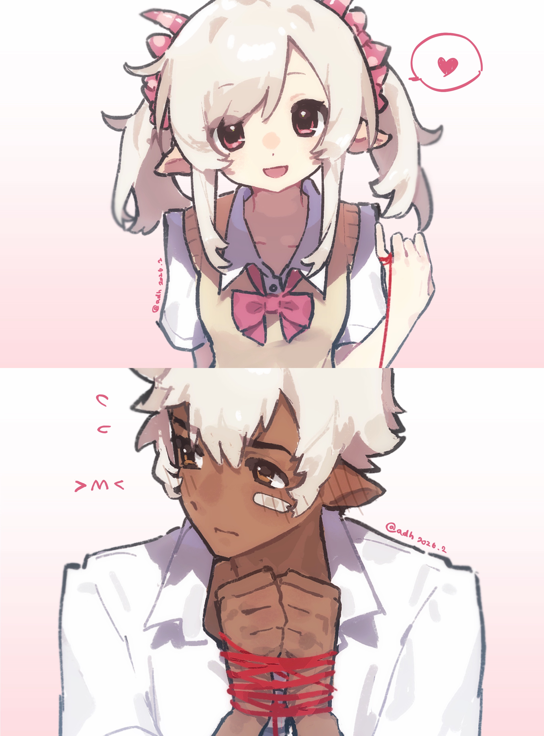 1boy 1girl :d absurdres adh_shi_shei animification averting_eyes bandaid bandaid_on_face bound bow bowtie breasts brown_eyes collared_shirt dark-skinned_male dark_skin dated fei_yangyang flustered hair_bow heart hetero highres humanization long_hair mei_yangyang open_mouth pink_eyes pointy_ears red_bow red_bowtie school_uniform shirt short_hair short_sleeves sidelocks signature small_breasts smile spoken_heart string string_of_fate sweater_vest tied_up_(nonsexual) twintails white_hair white_shirt xiyangyang_yu_huitailang yellow_sweater_vest