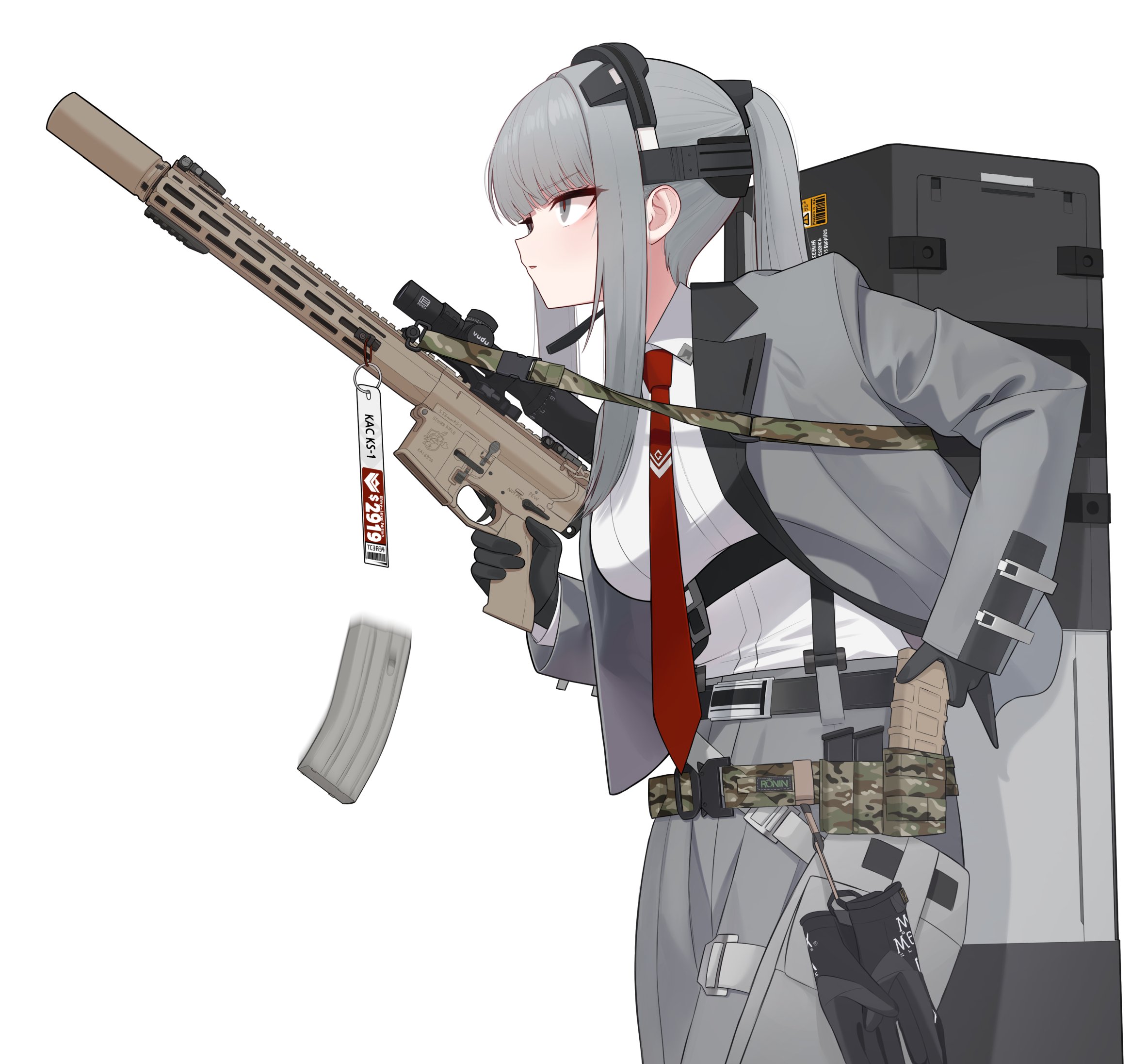 1girl ammunition_pouch assault_rifle bebetang belt black_belt black_gloves black_survival breasts camouflage chest_harness commentary eternal_return:_black_survival from_side gloves grey_eyes grey_hair grey_jacket grey_pants gun harness haze_(black_survival) highres holding holding_gun holding_weapon jacket kac_sr-15 long_hair long_sleeves looking_ahead magazine_(weapon) mechanix_wear medium_breasts necktie pants parted_lips ponytail pouch price_tag red_necktie red_pupils reloading rifle scope shirt shirt_tucked_in sidelocks sign simple_background sleeves_past_wrists solo strap suit_jacket suppressor tag unworn_gloves very_long_hair warning_sign weapon weapon_case white_background white_shirt wing_collar