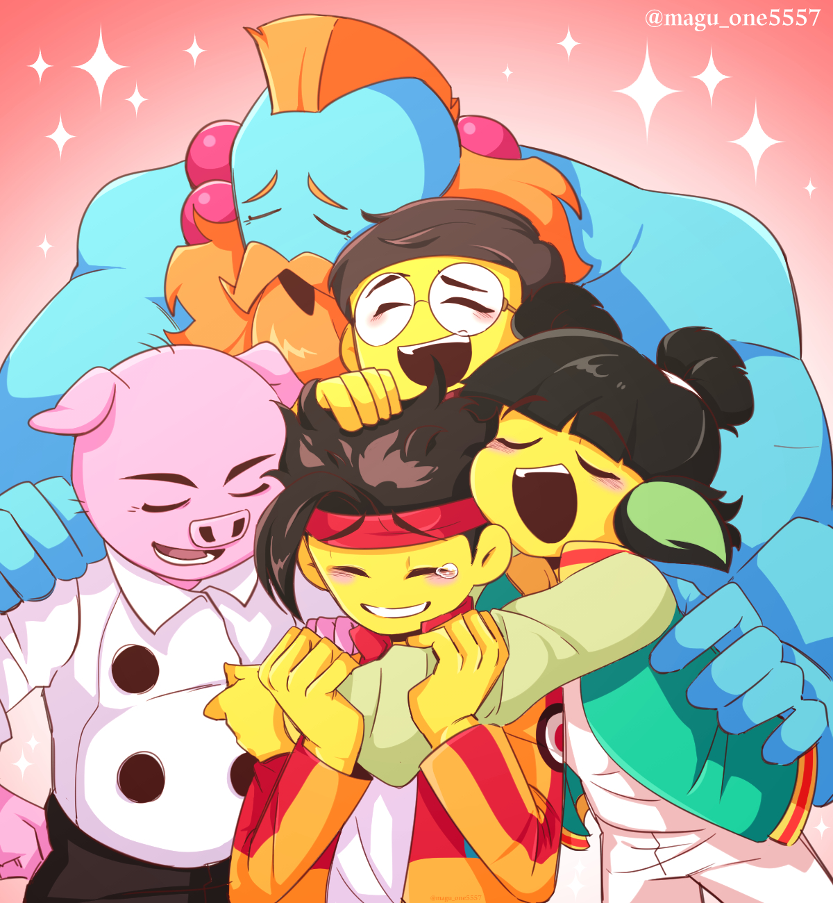 1girl 4boys ^_^ animification artist_name beard black_hair blue_skin blunt_bangs blush closed_eyes colored_skin commentary_request demon_boy double_bun eyebrows_visible_through_headband facial_hair furry furry_male glasses green_jacket group_hug hair_bun hand_on_another's_head hand_on_another's_shoulder headband highres hug jacket korean_commentary magu_5557 mei_(monkie_kid) mk_(monkie_kid) mohawk lego_monkie_kid multiple_boys open_clothes open_jacket open_mouth orange_hair orange_jacket pants pig_boy pigsy_(monkie_kid) red_headband round_eyewear sandy_(monkie_kid) shirt short_hair smile sparkle tang_(monkie_kid) tearing_up twitter_username u_u white_pants white_shirt yellow_skin