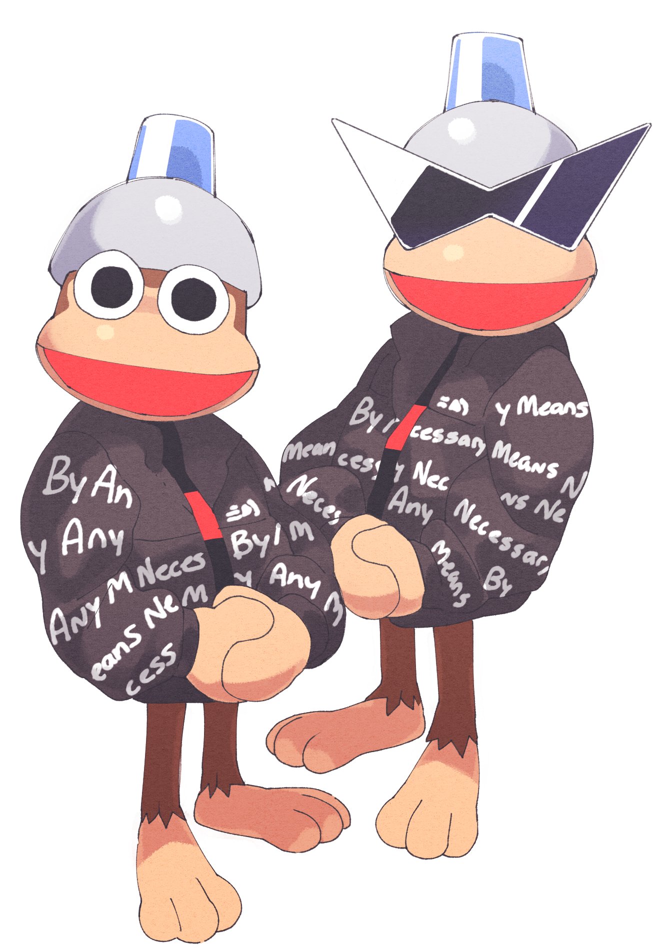 black_jacket clothes_writing commission down_jacket drip_(meme) full_body helmet highres inkerton-kun jacket kamina_shades looking_at_viewer meme monkey open_mouth own_hands_together pipo_monkey print_jacket saru_getchu second-party_source smile solid_circle_pupils sunglasses supreme_(brand) the_north_face triangular_eyewear