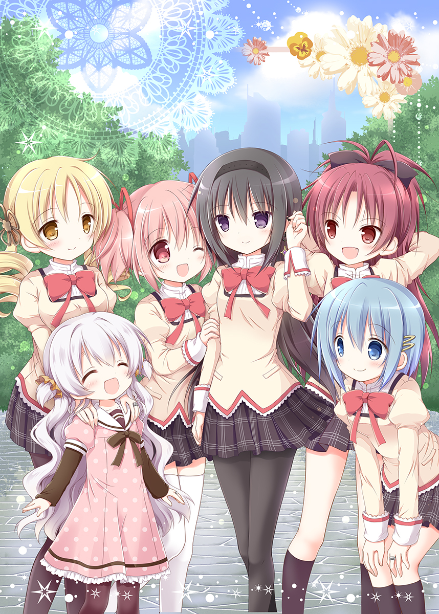 6+girls ;d akemi_homura arms_behind_head black_bow black_hair black_hairband black_pantyhose black_skirt black_socks blonde_hair blue_eyes blue_hair blue_sky blush bow bowtie breasts brown_bow brown_bowtie brown_ribbon building closed_eyes cloud collared_shirt commentary_request day dress drill_hair fang flower hair_bow hair_flower hair_ornament hair_ribbon hairband hairclip hand_on_another's_arm highres jewelry kaname_madoka lens_flare long_hair long_sleeves looking_at_another mahou_shoujo_madoka_magica mahou_shoujo_madoka_magica:_hangyaku_no_monogatari miki_sayaka mitakihara_school_uniform momoe_nagisa multiple_girls nanase_miori neck_ribbon one_eye_closed open_mouth outdoors outstretched_arms pantyhose pink_dress pink_eyes pink_hair plaid_clothes plaid_skirt pleated_skirt polka_dot polka_dot_dress ponytail puffy_short_sleeves puffy_sleeves purple_eyes red_bow red_bowtie red_eyes red_hair red_ribbon ribbon ring sailor_collar sakura_kyoko school_uniform scrunchie shirt short_hair short_sleeves skirt sky smile socks sparkle standing thighhighs tomoe_mami tree twin_drills twintails two_side_up white_hair white_thighhighs yellow_eyes yellow_scrunchie